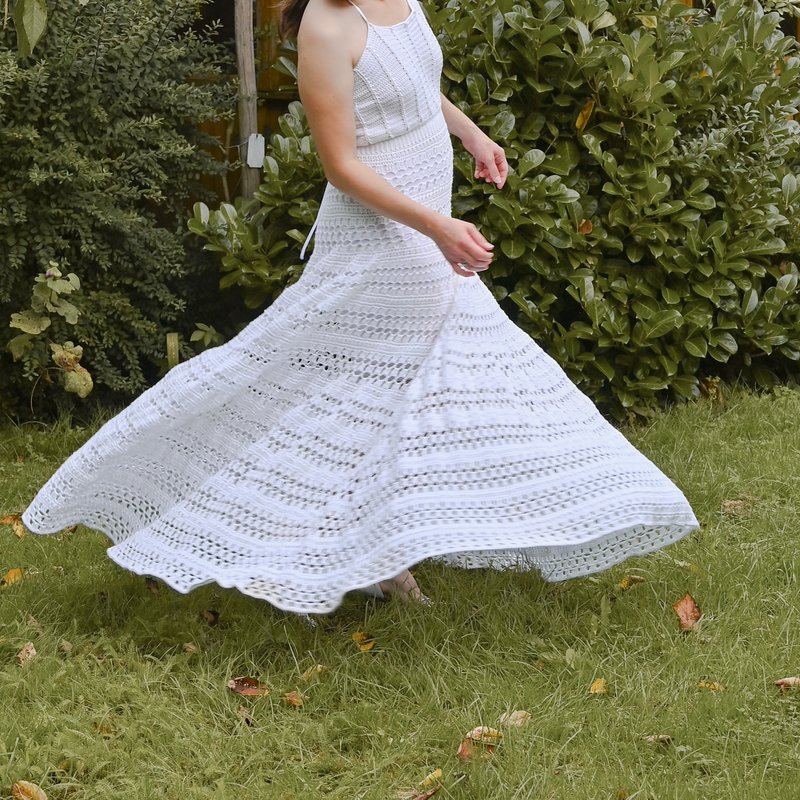 Make this maxi dress into your unique dream dress. Depending on your choice of color it can be either very festive (maybe even for a boho wedding) or more down to earth. By using simple cotton yarn, this dress is very affordable. This dress has an awesome swing and it is just so much fun to wear it.