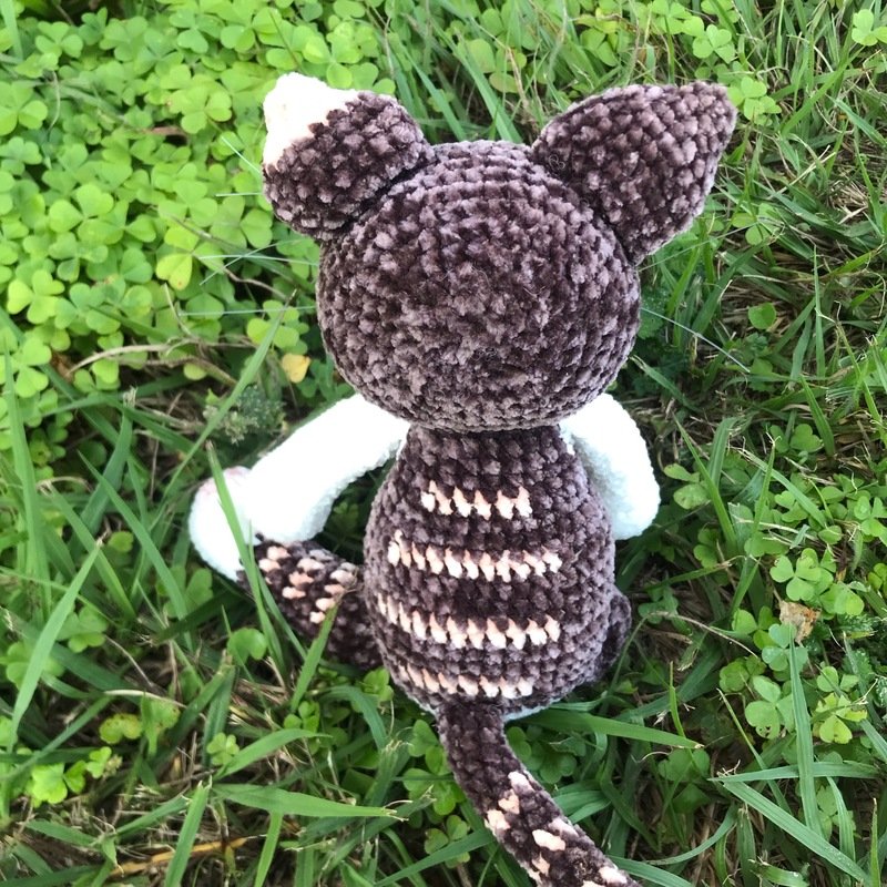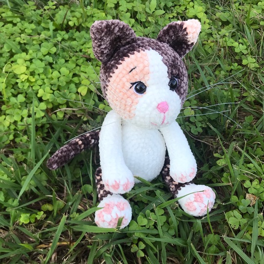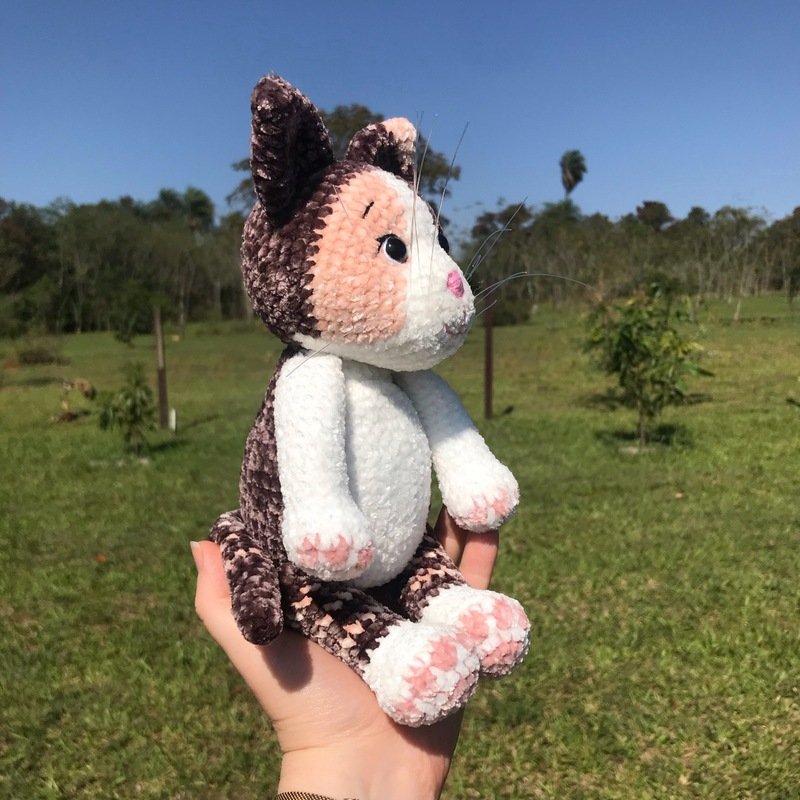 The size of Mizi depends on the materials you use and the way you crochet. I used a thin chenille yarn for the instructions and crocheted with X stitches. The cat is about 30 cm tall.