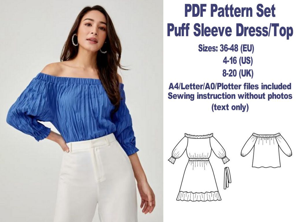 2). Off the shoulder puff sleeve tunic, finished back length from waist 48 cm.