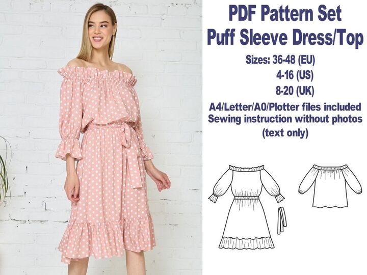 1). Off the shoulder puff sleeve dress with belt, finished back length from waist 87 cm.