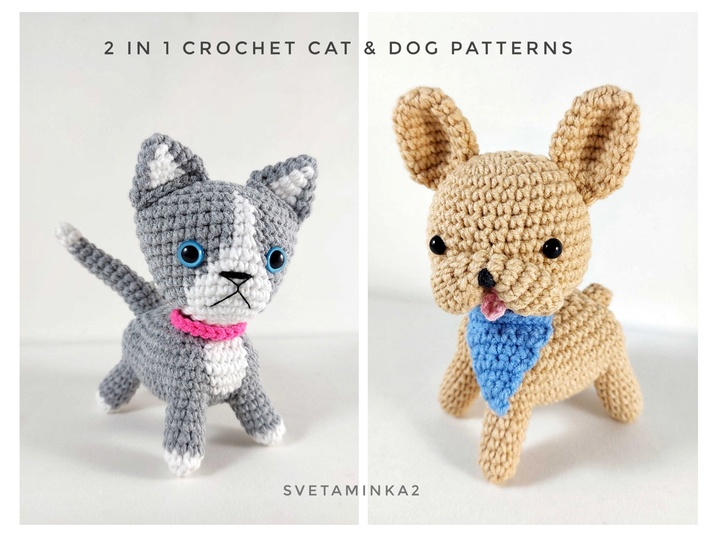 Amigurumi 2 in 1. Cat Crochet Pattern and French Bulldog Crochet Pattern to make cute amigurumi kitten and dog.