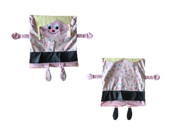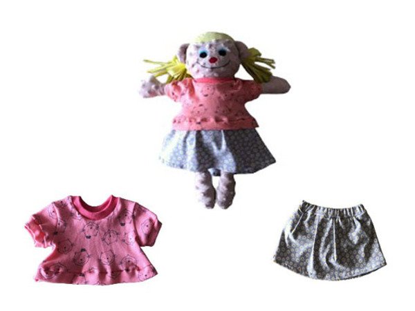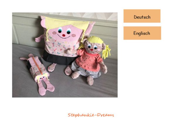 The cushion cover and pencil case are sewn from cotton fabrics. The doll is sewn from cuddly fabrics like minky fleece, velour, or fleece.