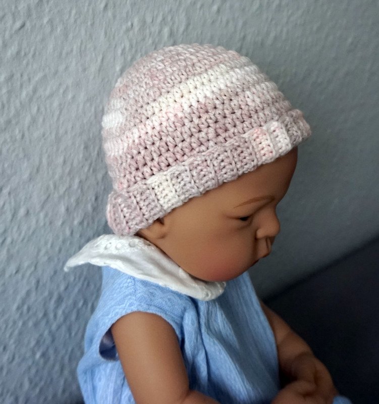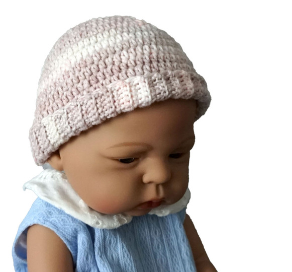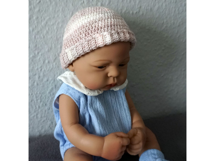 The finished beanie fits a standard baby dolls with a head circumference of approx. 13 inch.