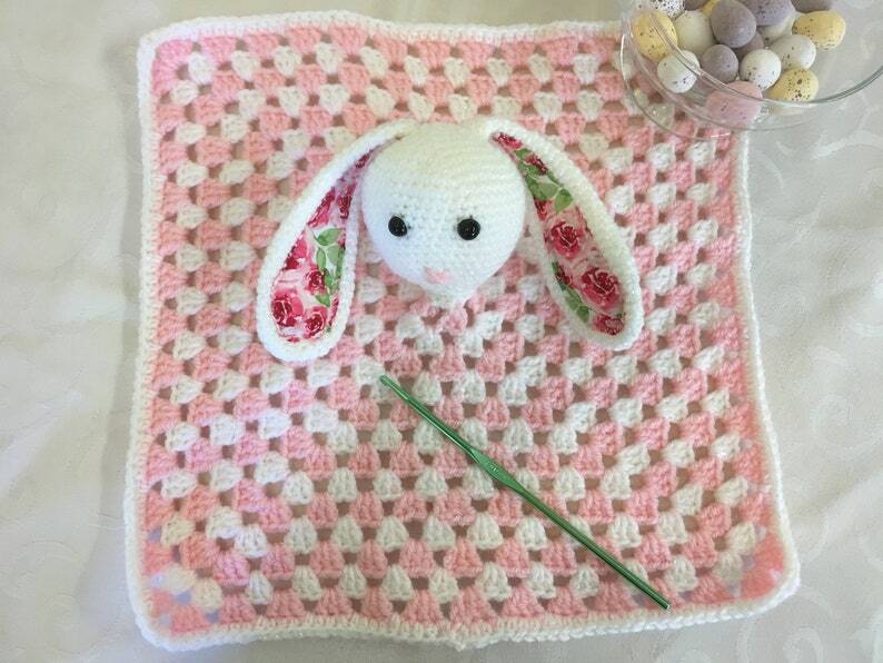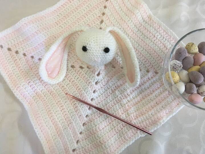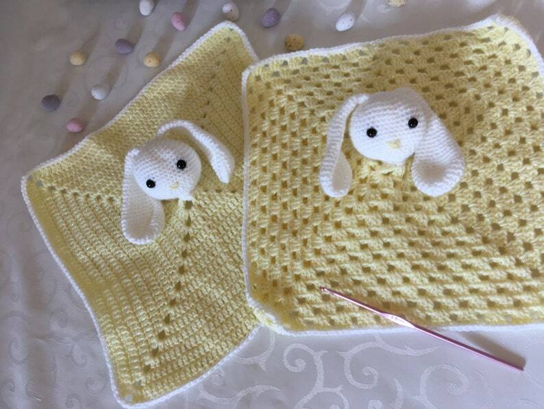 Learn how to crochet this cute bunny comforter blanket with variations in the blanket section of the pattern and images included in the written document.
