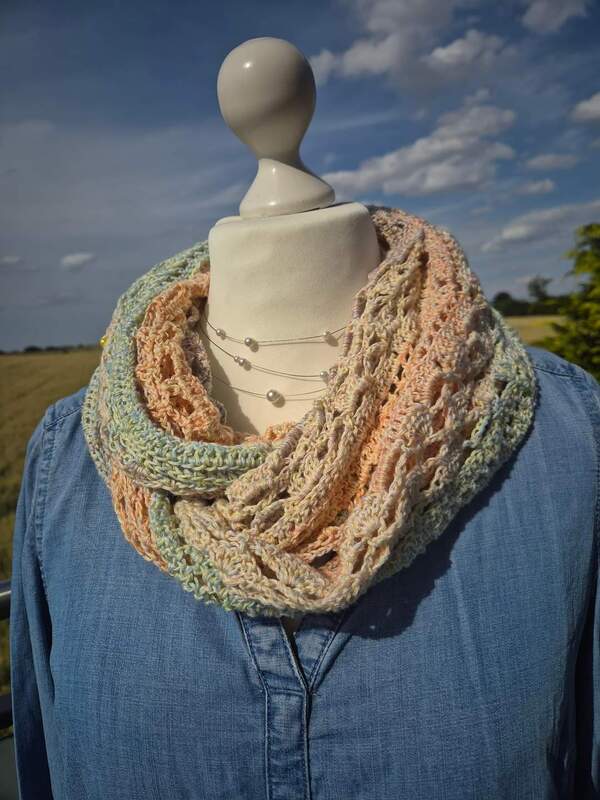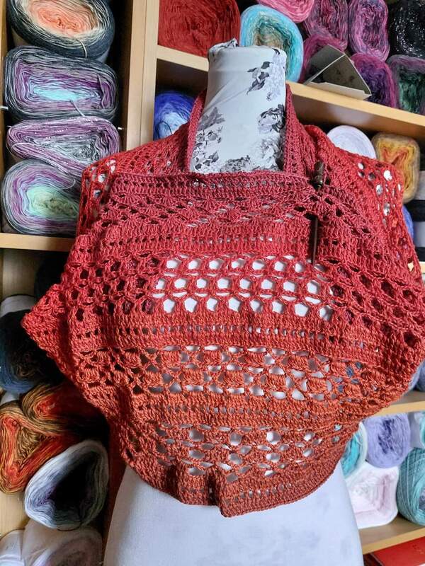 Es kann mit jedem gewünschten Garn gehäkelt werden, ich würde dazu einen Farbverlaufsbobbel empfehlen, die Lauflänge hängt von der gewünschten Größe und Form ab.