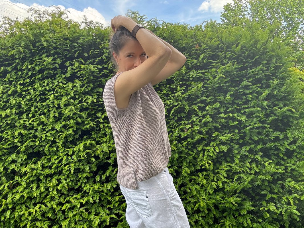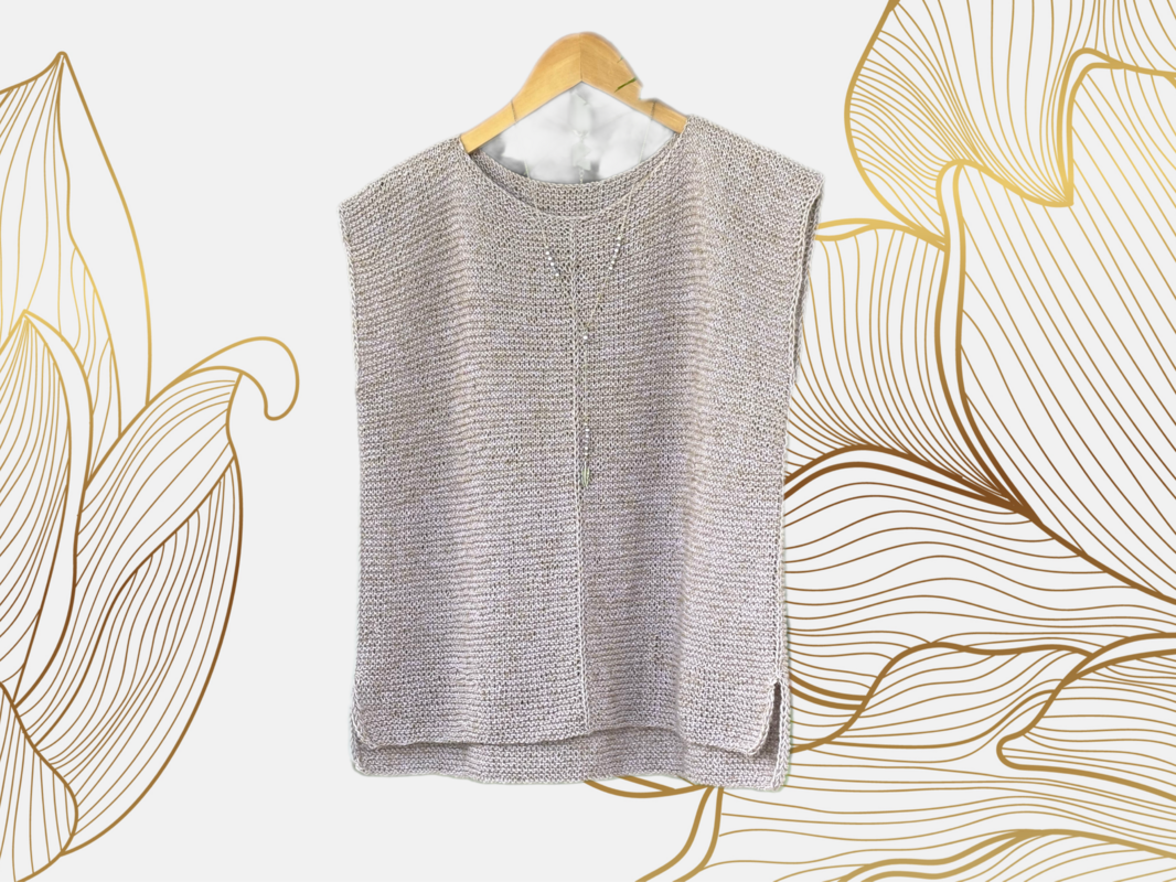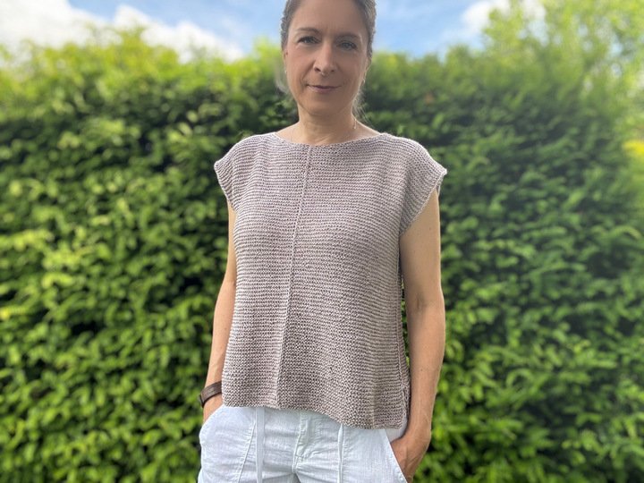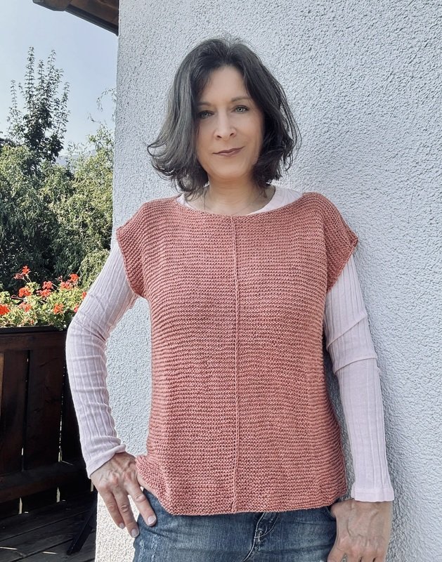 I combined Garter Stitch, faux seams and a split hem to create a versatile and comfortable piece that is a wardrobe essential you’ll frequently reach for. It is a very basic shape that can be dressed up or down.