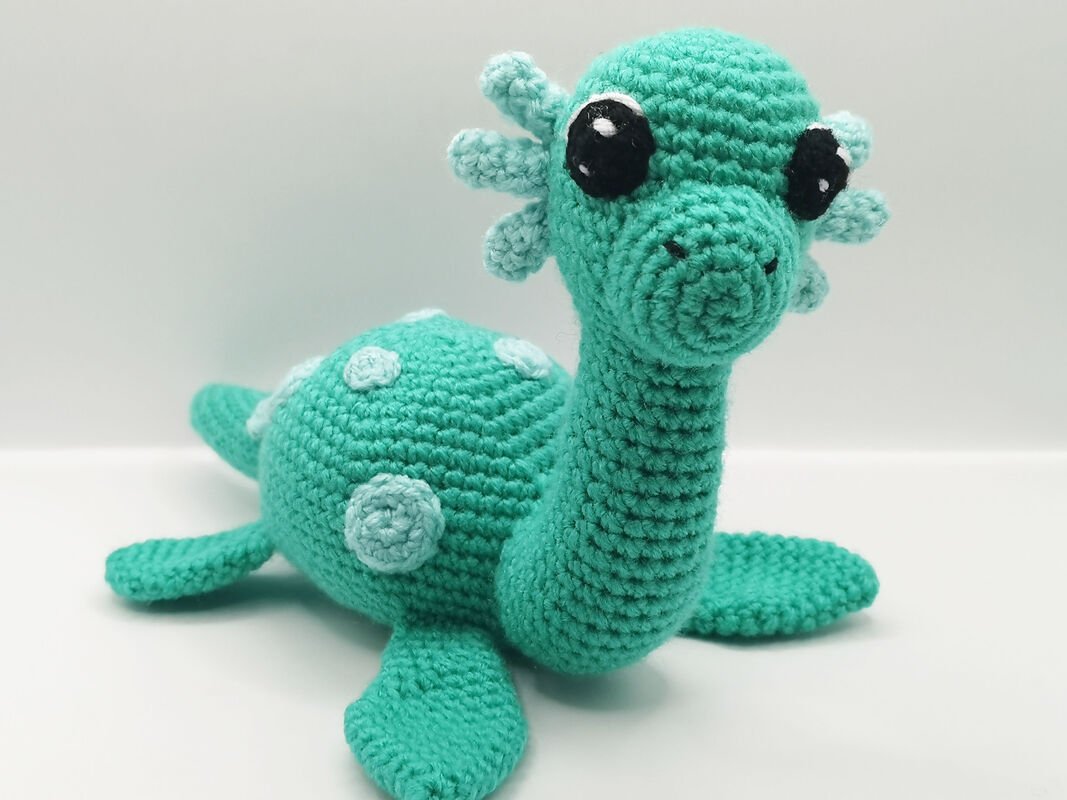 The Plesiosaurus becomes a friendly sea monster with a few additional details. The size is perfect as a cuddly toy companion for a child. With the simple dinosaur version, only a little bit has to be sewn together. As a sea monster, the additional details make it a little more complex, but it is still easy to rework.