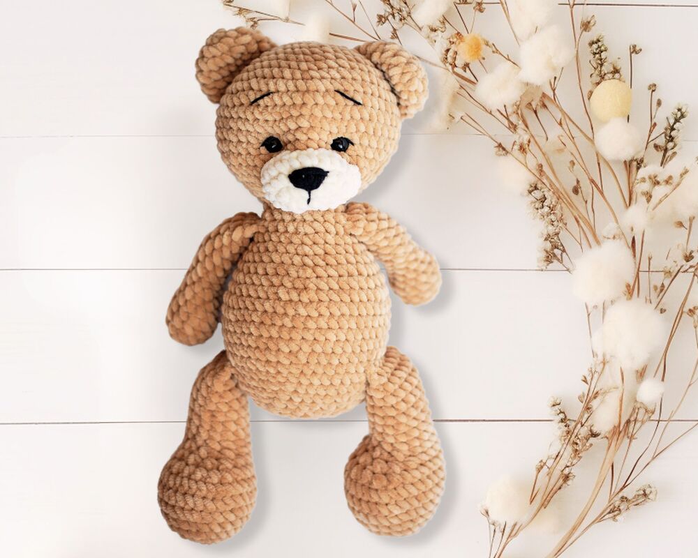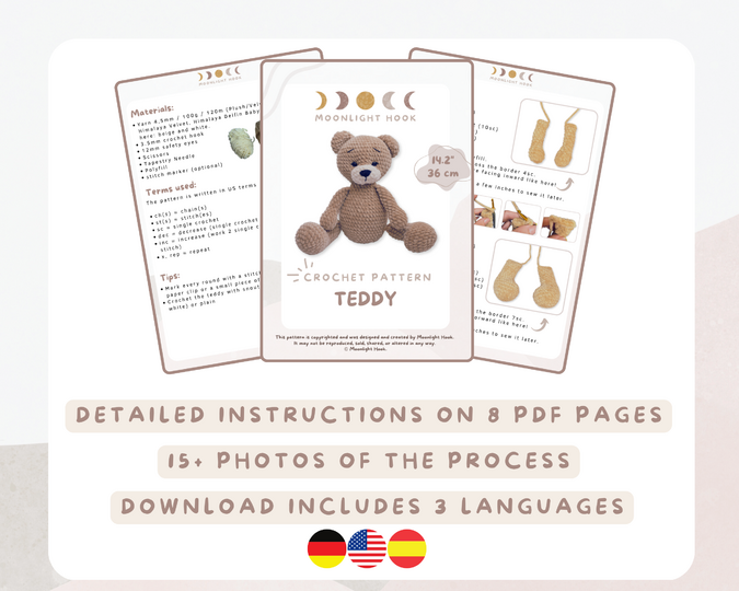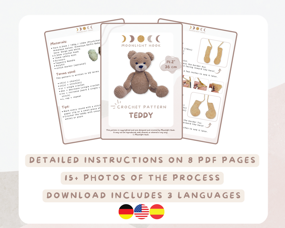 Create an adorable teddy bear with this detailed crochet pattern, measuring 36 cm (14.2 inches) from head to toe. The pattern is lovingly designed and includes many pictures to guide you step by step through the process of making the teddy. The eyelashes give the bear an especially cute look, and the eyebrows complete the affectionate facial expression. The teddy bear is the perfect gift, for example, for a newborn or as a cuddly toy for children. The snout is crocheted separately and can be made in the same color as the rest of the bear. Get this charming crochet pattern and create a unique gift that brings joy!