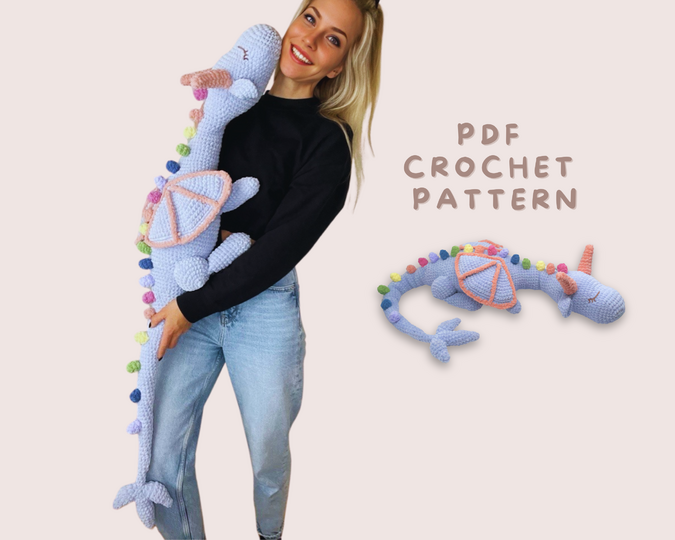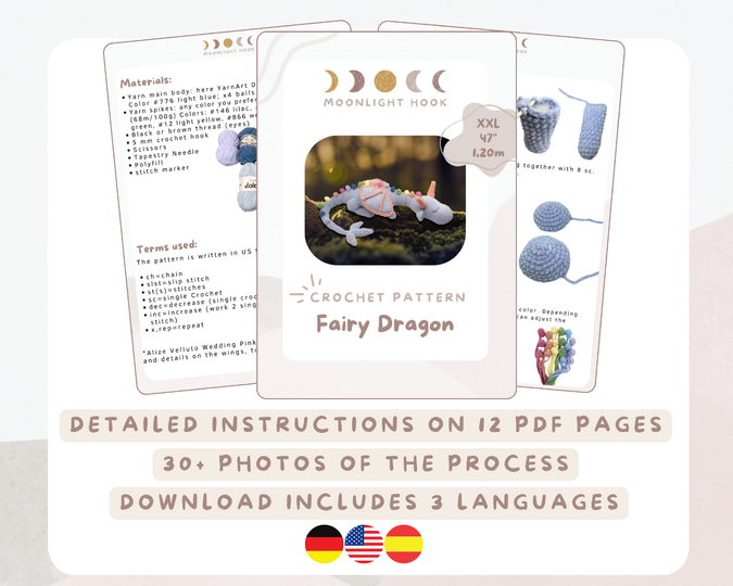 Dive into the magical world of crochet with our breathtaking pattern for the XXL Fairy Dragon! This dreamy dragon, measuring an impressive 1.20 m (47”), is not only a stunning decorative piece but also a loving companion. The pattern features the light blue rainbow dragon – these colors can be easily swapped to create your own unique fairy dragon. The pattern includes numerous pictures that guide you step by step through the crochet process, ensuring you can effortlessly create this masterpiece. Whether for yourself or as an extraordinary gift, this sleeping dragon will enchant everyone!