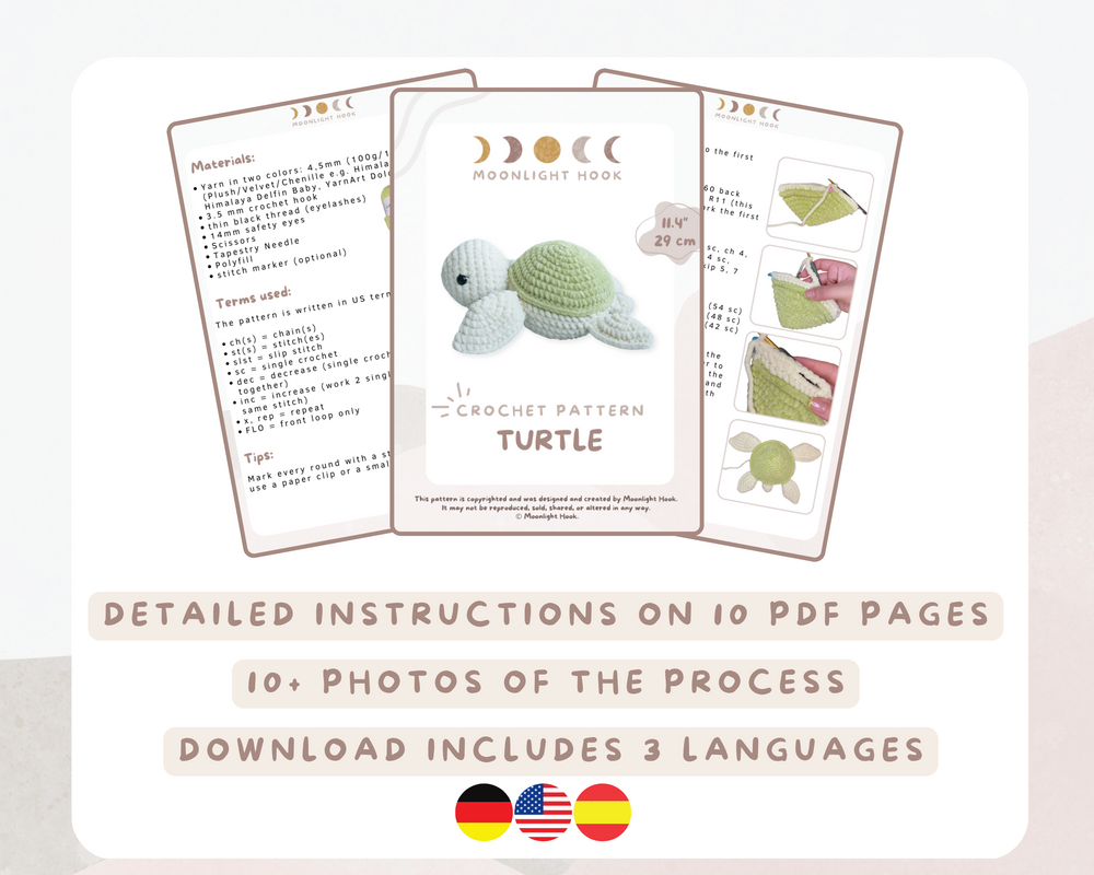 Discover the enchanting crochet pattern for this “Sweet Turtle” – an absolute eye-catcher in any crochet collection! This adorable turtle, with its charming eyelashes and heartwarming gaze, is sure to bring a smile to anyone’s face. At 29 cm (11.4”) in size, it’s perfect for cuddling, decorating, or gifting. The pattern is ideal for crochet enthusiasts who want to showcase their skills while creating a unique and lovable project. Whether for young or old, this turtle will quickly become a new favorite!