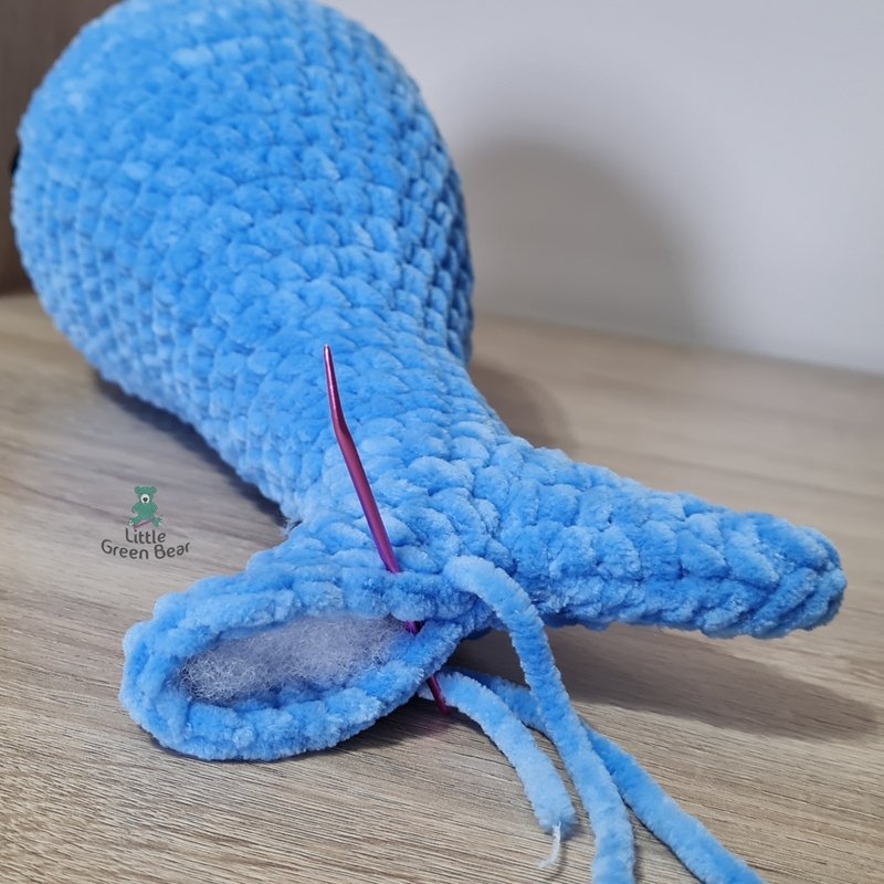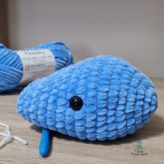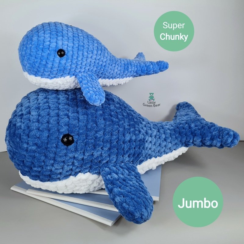 I’ve made Wesley the whale using a super chunky #6 weight plush yarn. This is ideal for a big soft and huggable toy and is a quick make, you can make your whale in a few hours. Wesley can be made with or without the white underside piece, you can decide. He is 12.5 inches long in super chunky weight yarn - 19.5 inches long in jumbo - (when made with the recommended materials).