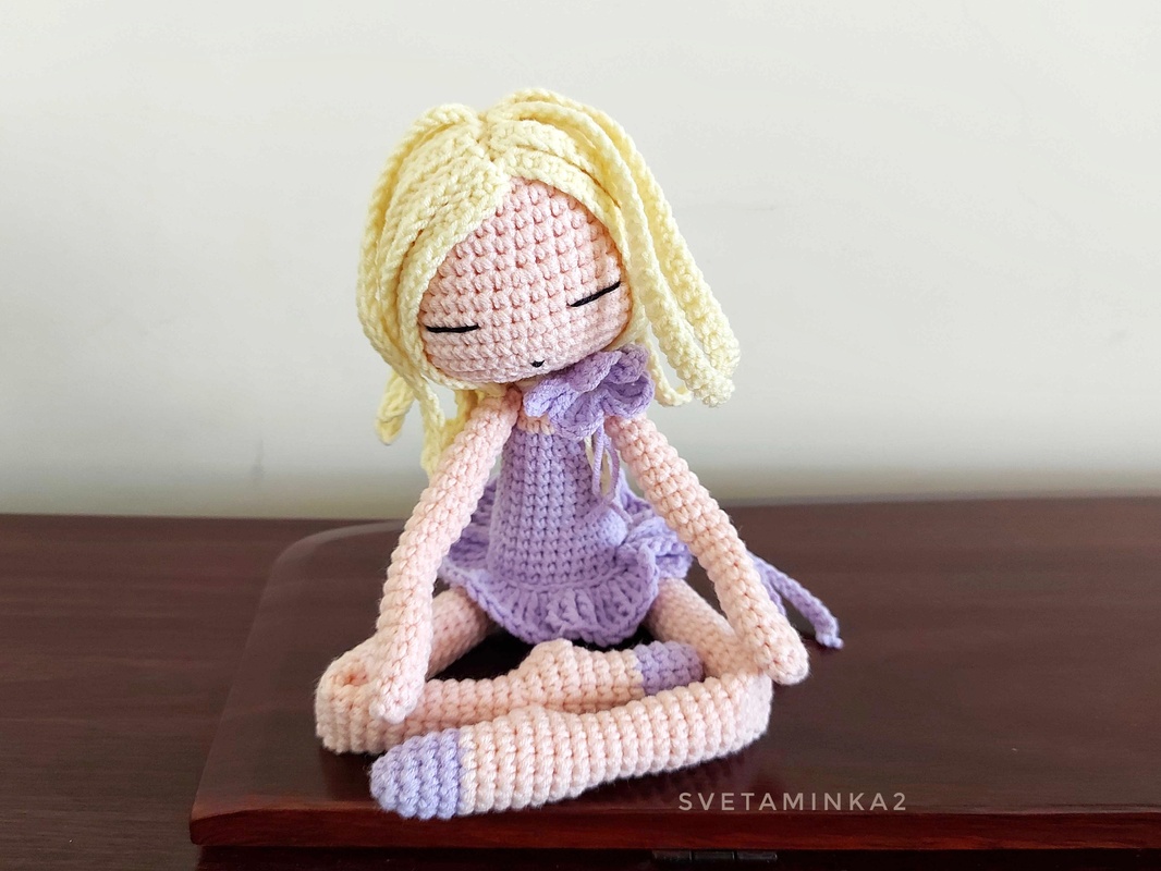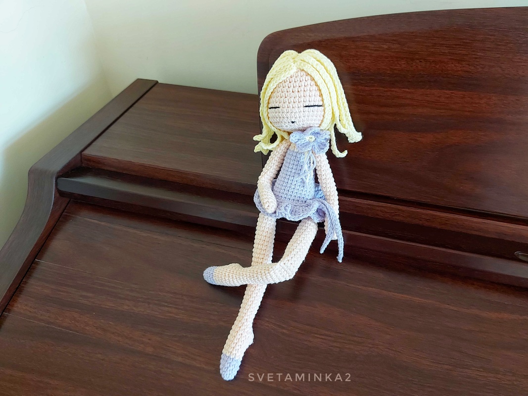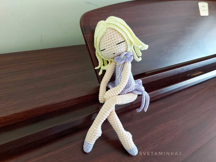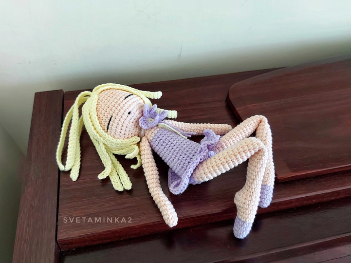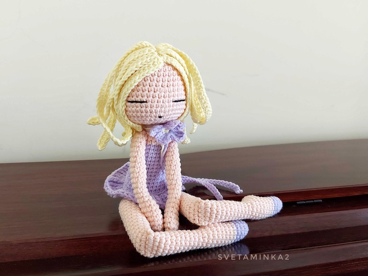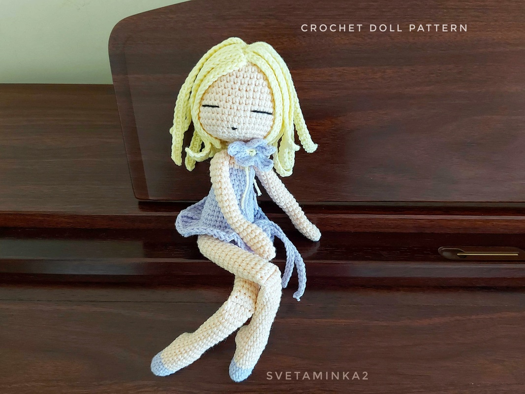 Crochet Doll Pattern to make a cute amigurumi toy. This doll is quite simple to crochet. Just look at her! She's wearing a dress, but you don't need to crochet clothes separately. Her legs are simple but so graceful. And her relaxed hairstyle does not require much effort! It is both an interior toy and a doll to play with! You can sit her on any way you like! I think that this crochet project based on the slogan "minimalism and fineness".