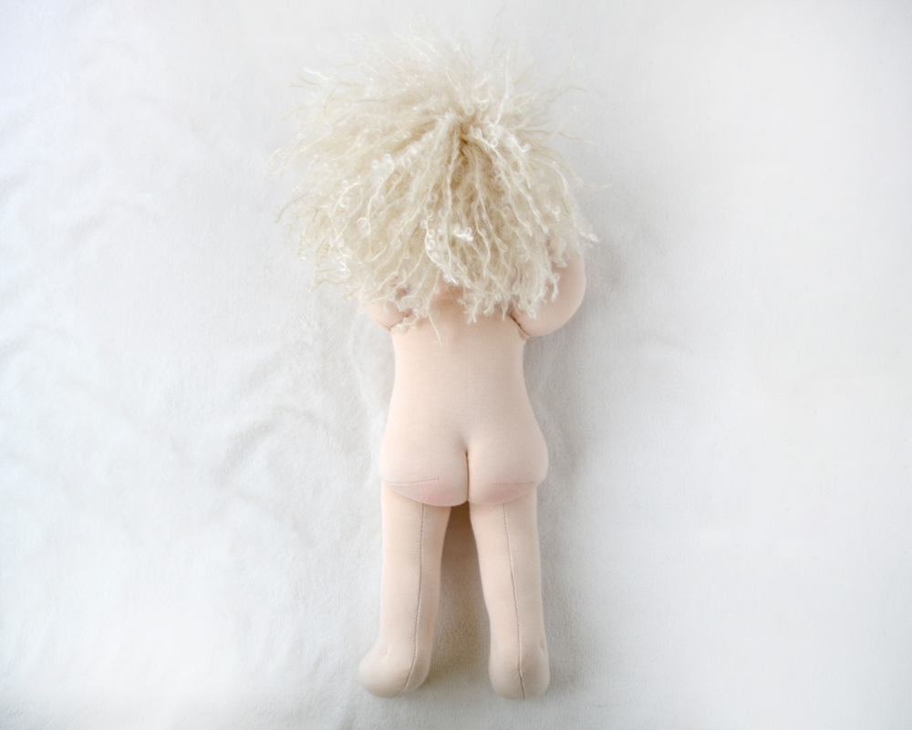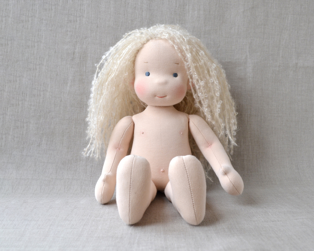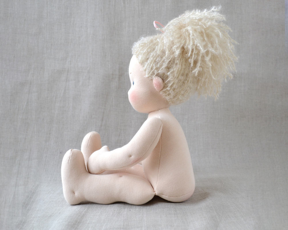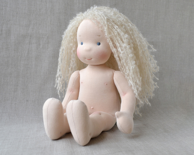 cotton doll jersey for head and body, sheep wool for filling, mohair boucle yarn for hair