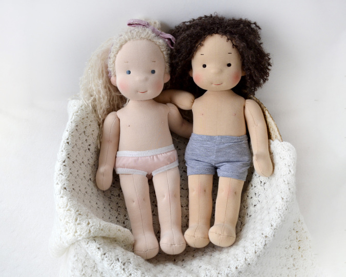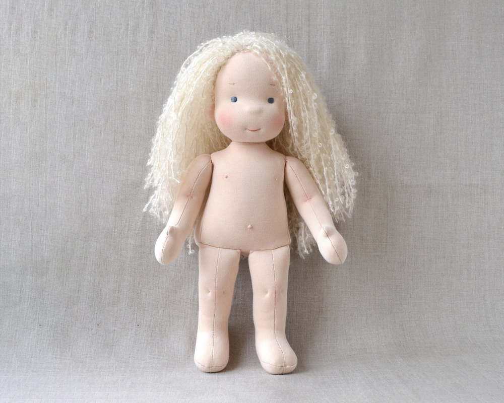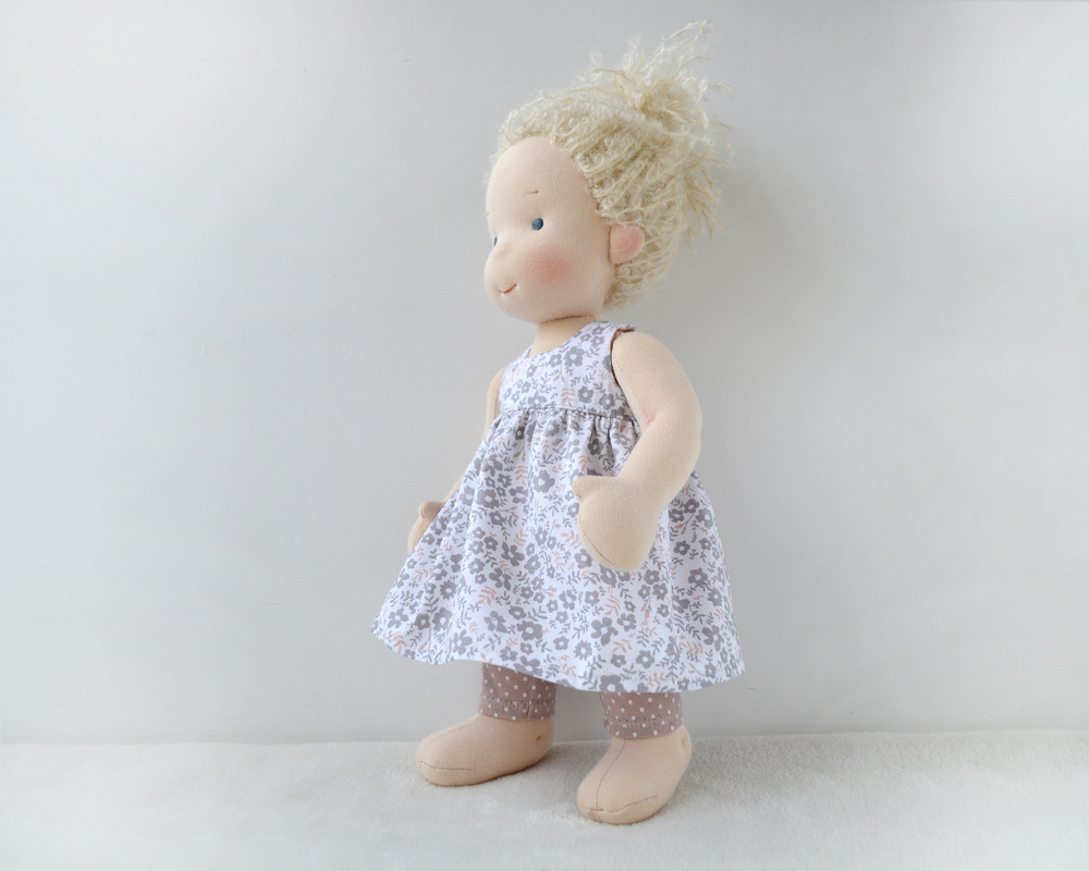 With this sewing pattern, you can create a 15 inch (38 cm) Waldorf doll. This Waldorf Doll has long soft hair, a bottom, a navel, ears and eyebrows. The doll is made exclusively from natural materials: cotton jersey, mohair boucle yarn and natural sheep's wool.