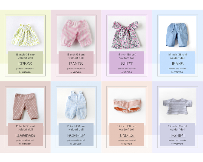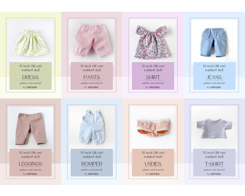 BONUS: Patterns of doll clothes with sewing process description (dress, pants, shirt, leggings, undies, jumpsuit, jeans, t-shirt, socks)