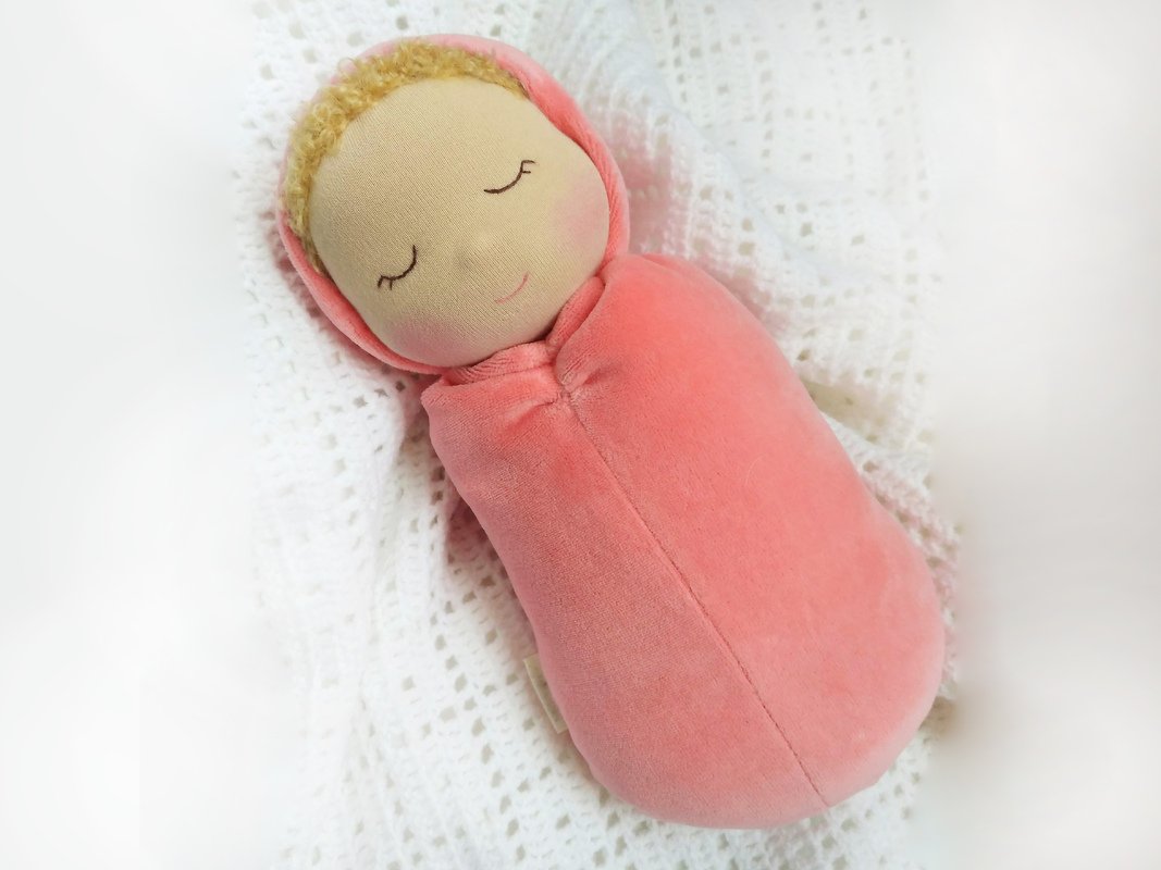Using this tutorial you can sew a sweet swaddle sleeping doll into a bed for your most beloved baby. For create this doll are used only natural materials: cotton jersey, sheep wool, woolen yarn. A complete list of required materials and tools is in the tutorial. As well as step-by-step photo-instruction. It includes 22 sheets and 98 photos. You will learn how to embroider eyes step-by-step, make a nose and chubby cheeks. This pattern is very easy to follow!