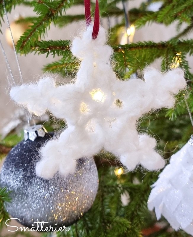 3-4 gr Fluffy yarn. Used here is the yarn Maya by Trysil Garn, a fluffy alpaca blend with 90 metres per 50 grams. Any fluffy yarn will do, but the snow flake holds its shape best if the yarn is on the “sturdy” side.