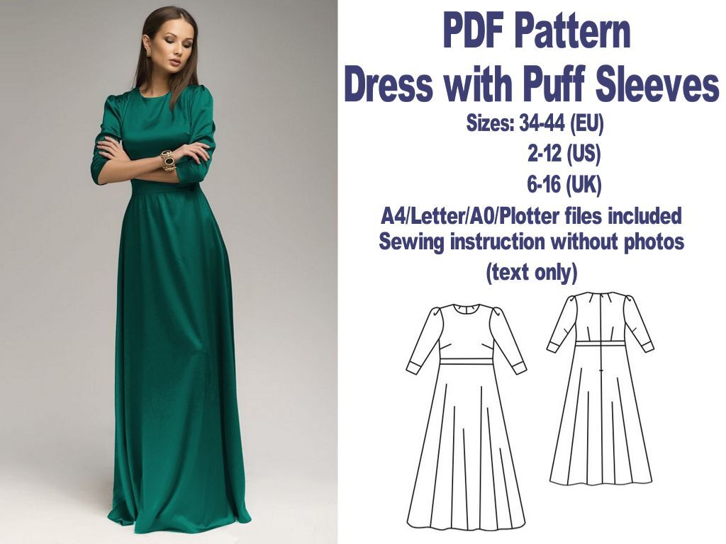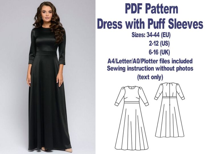 Dresses with ¾ length puff sleeves, bust darts, circle skirt (two length option), in-seam pockets and invisible back zipper.