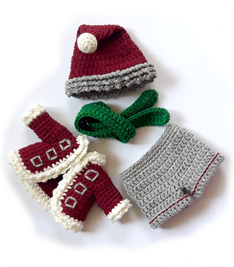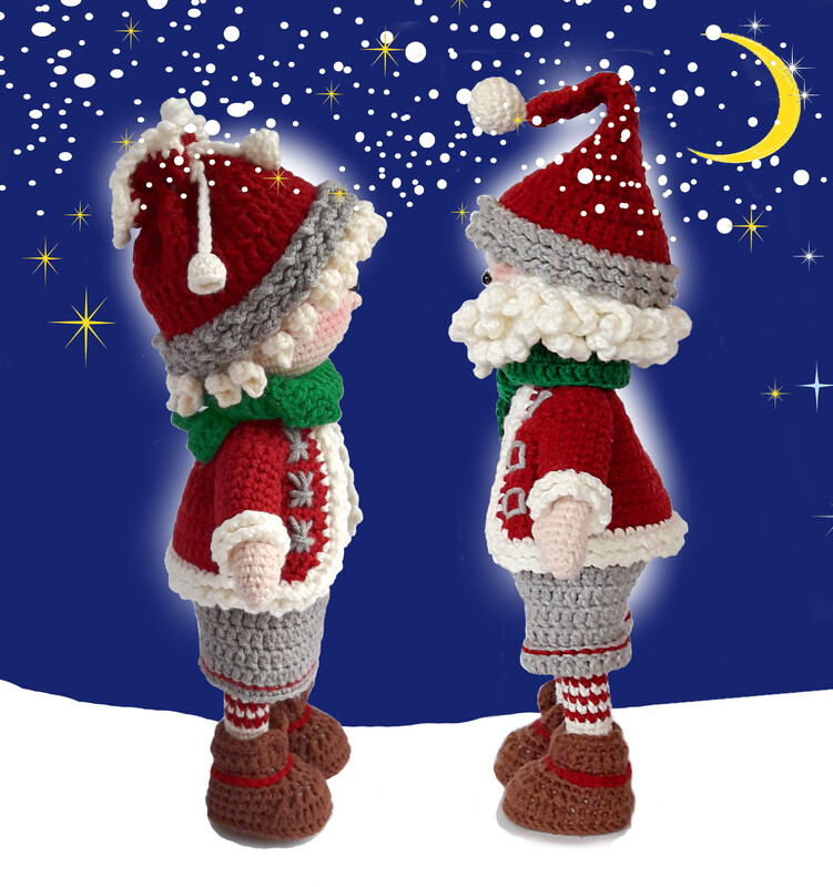 This is a PDF crochet pattern for creating a charming Christmas scene featuring Santa Claus, Mrs. Claus, and their family Christmas tree.
