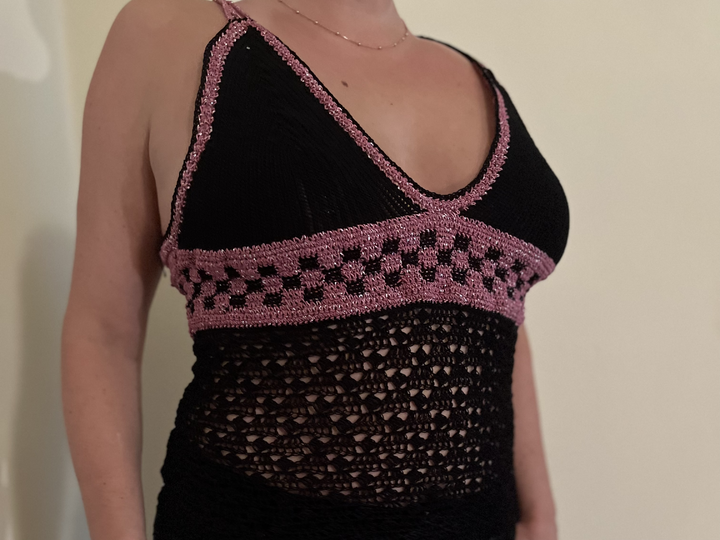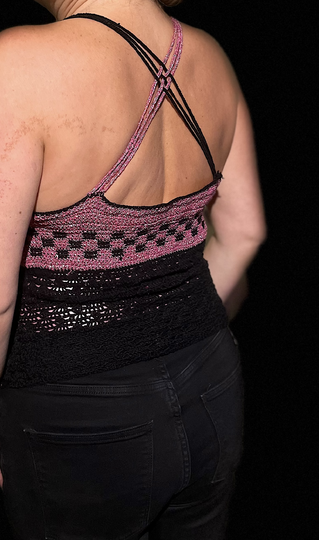 The tank top combines two different yarns. The glitter effect and the checked pattern as well as the woven bridge make the top a great eye-catcher.