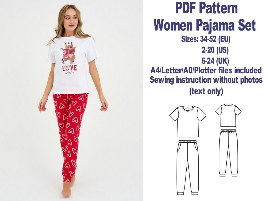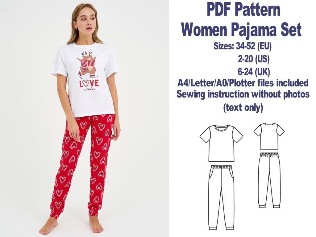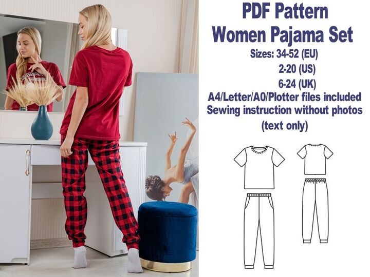 Using this PDF pattern you can sew women pajama set: T-shirt, finished back length – 56 cm and jogger pants with cuffs, elastic casing and pockets, finished side length from waist – 105 cm.