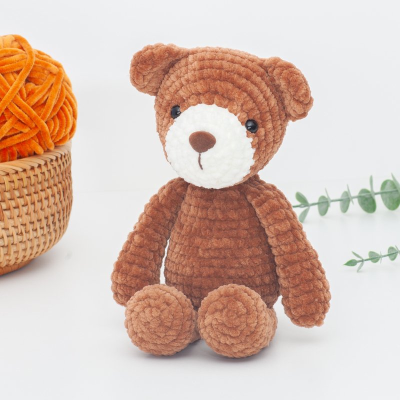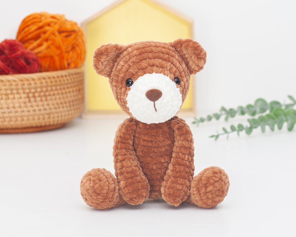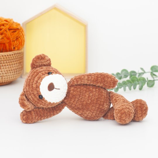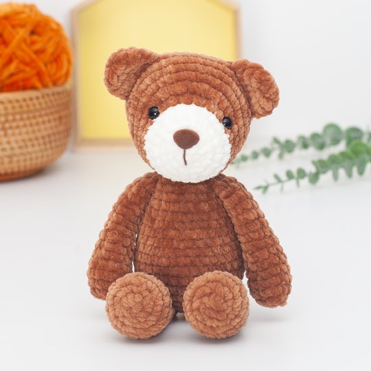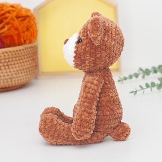 · Bulky yarn (velvet/ chenille). I used “Himalaya Dolphin Baby” 100g/120m (100% Micro Polyester) in Brown #80337 and cream #80308. Similar yarns: Katia Bambi, YarnArt Dolce, Hobbii Baby Snuggle.