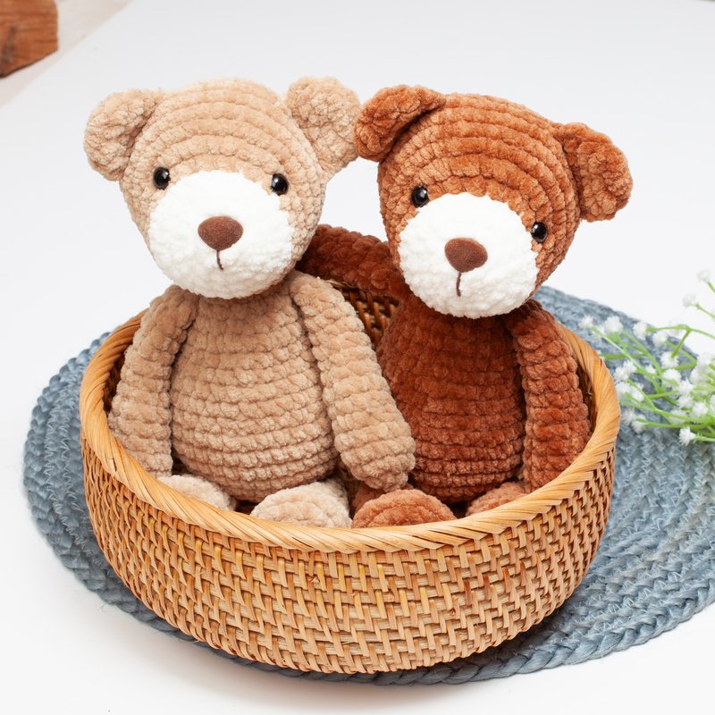 If you use the yarn and hook indicated, the bear will be about 28 cm (11 inches) tall standing and 19 cm (7.4 inches) tall sitting. You can make it bigger or smaller by using another type of yarn but please, adapt the crochet hook, eyes and nose accordingly.