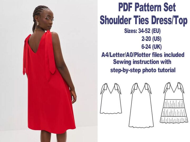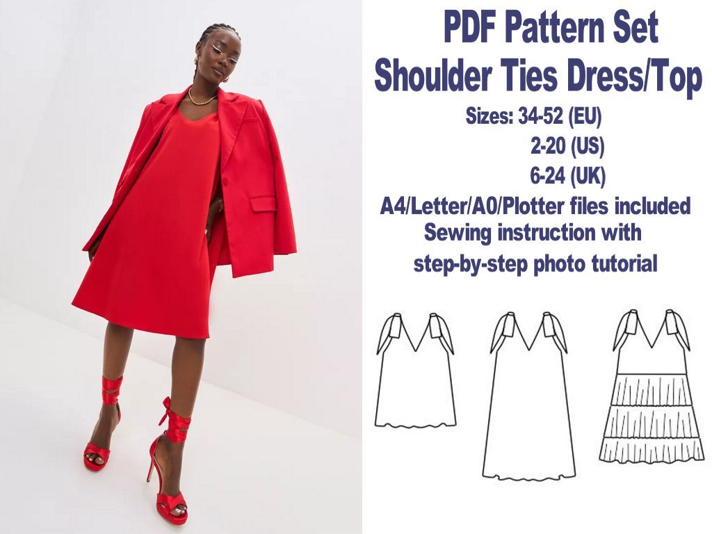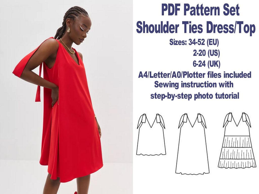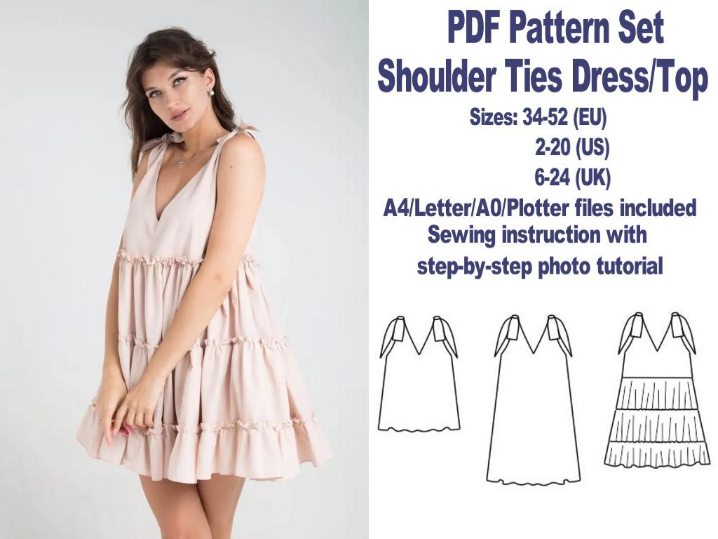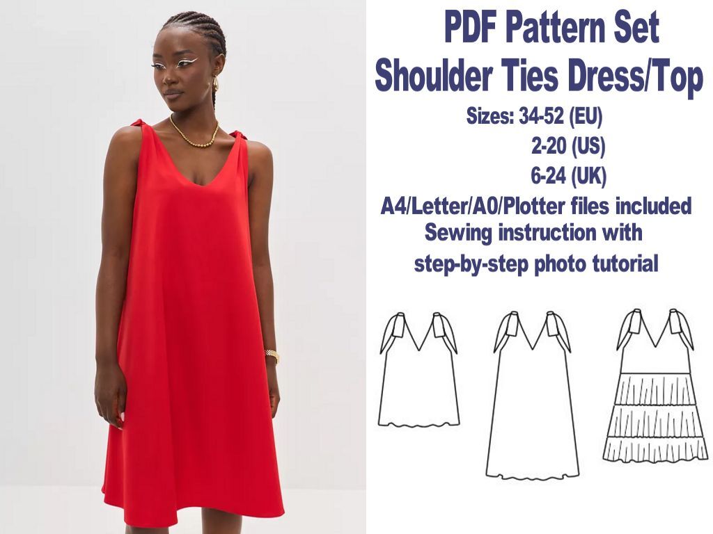 3) Option C – Tiered A-line dress with a deep V-neckline front and back and wide, tie-top shoulder straps, finished length from neck depth to bottom – 70 cm.