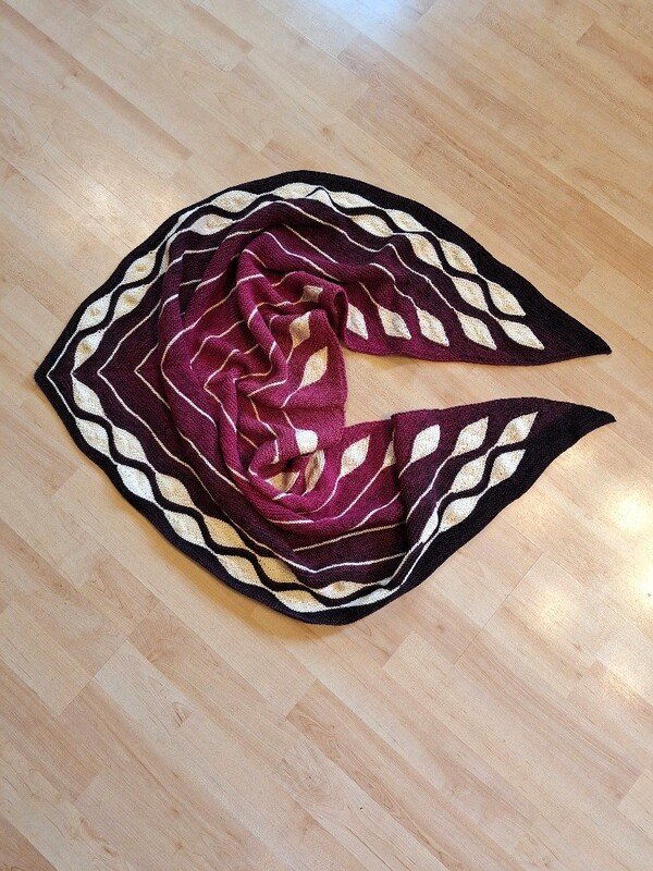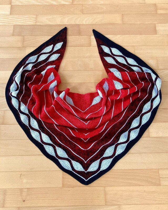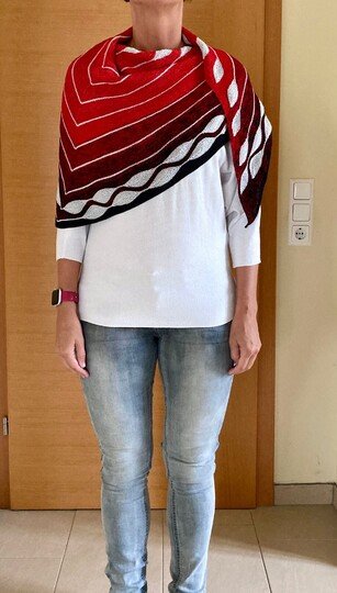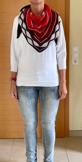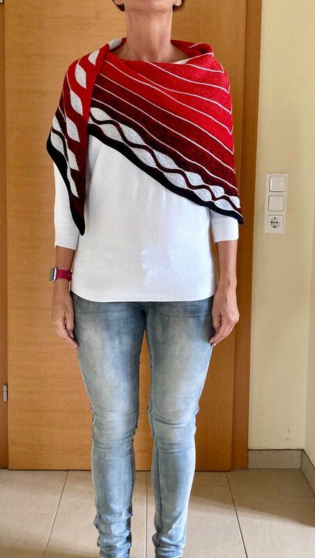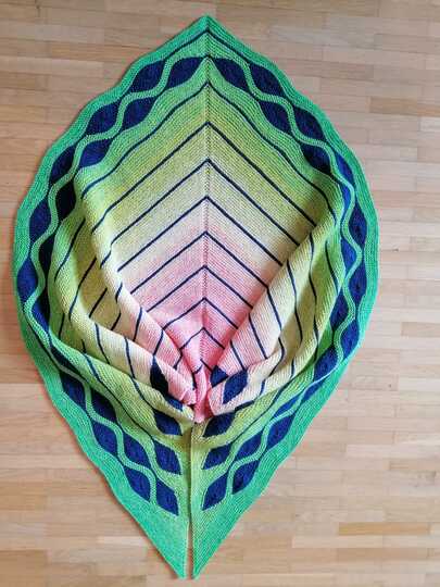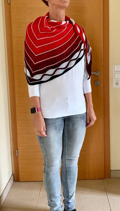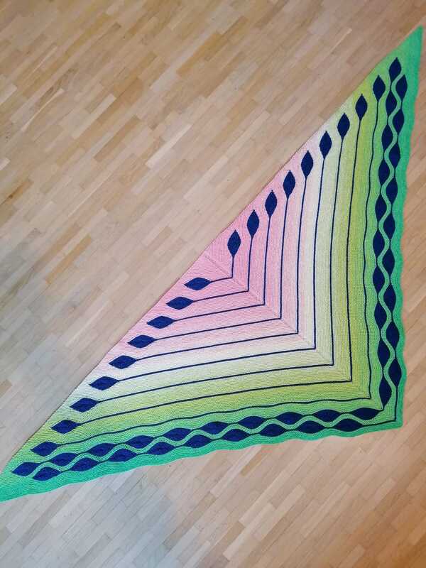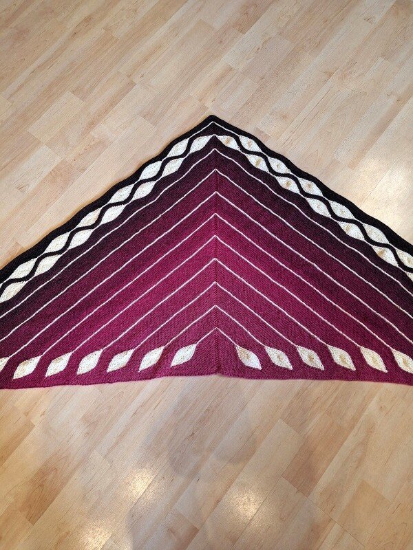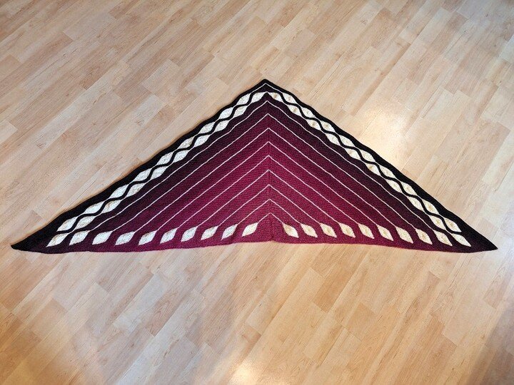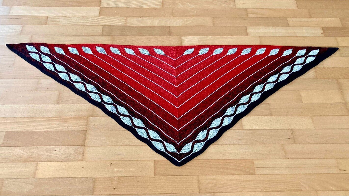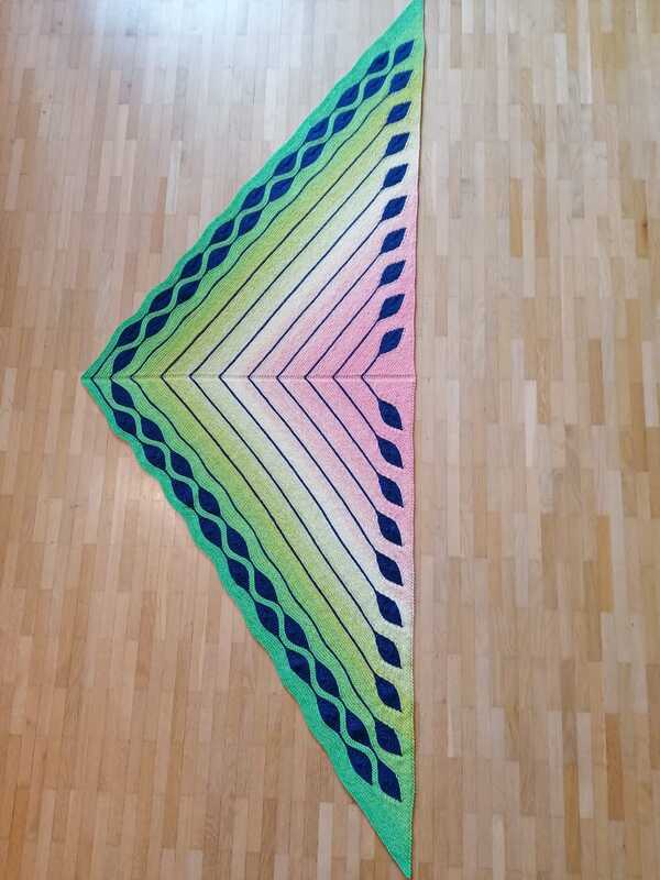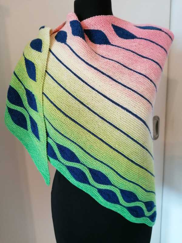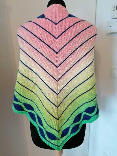 Es ist ein gleichschenkeliges Dreieckstuch mit vielen verkürzten Reihen.