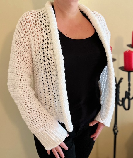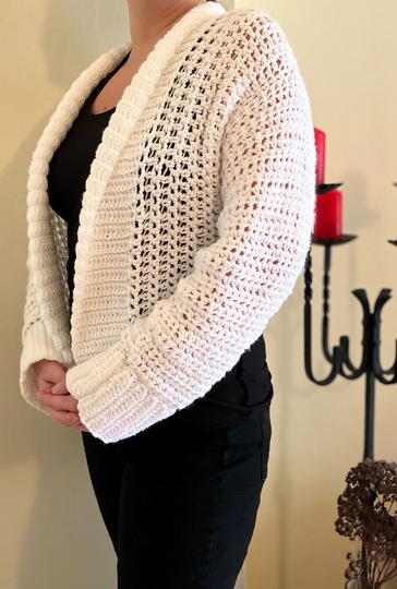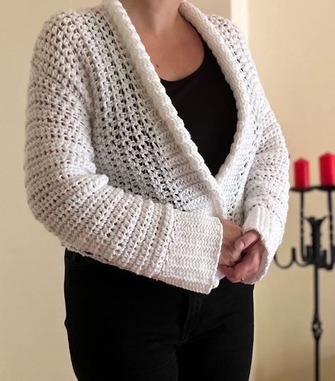 The pattern of the cardigan itself consists only of half double crochet stitches and single crochet stitches. Since the individual parts are crocheted very loosely with a thick wool, it is ready quickly and invites you to snuggle up.