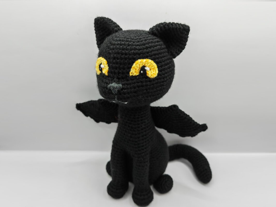 The cute comic-style cat can be crocheted as a regular cat or vampire cat with wings.