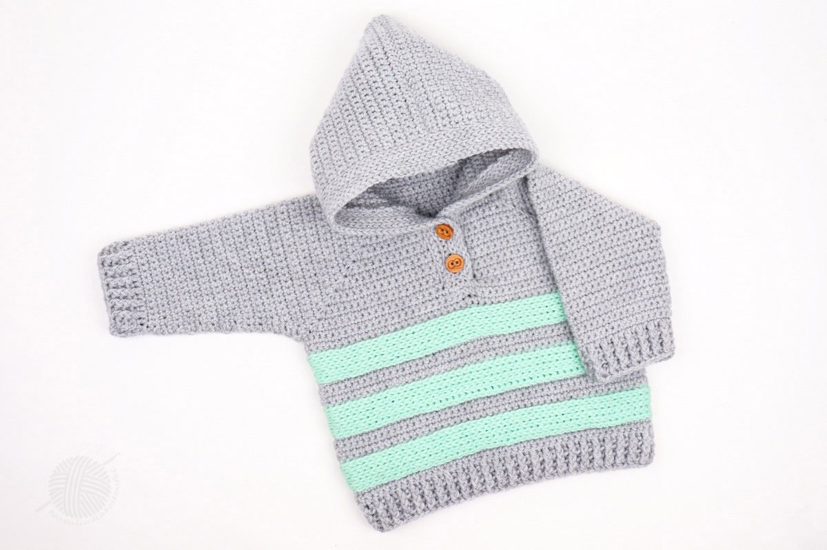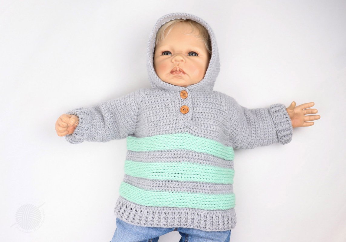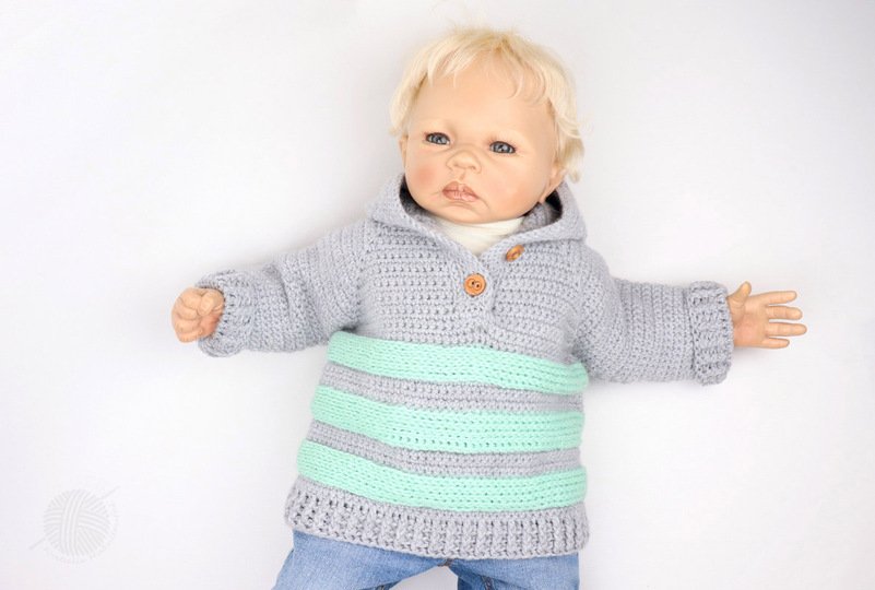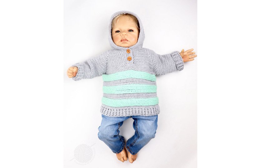 This PDF crochet pattern consists of illustrated tutorial for crocheting a baby or children's jumper for sizes 0 m. to approx. 5-year-old child with the two-colour pattern. The jumper can be crocheted for both summer and winter (depending on the wool). This jumper is crocheted as a raglan jumper and therefore has no annoying seams.