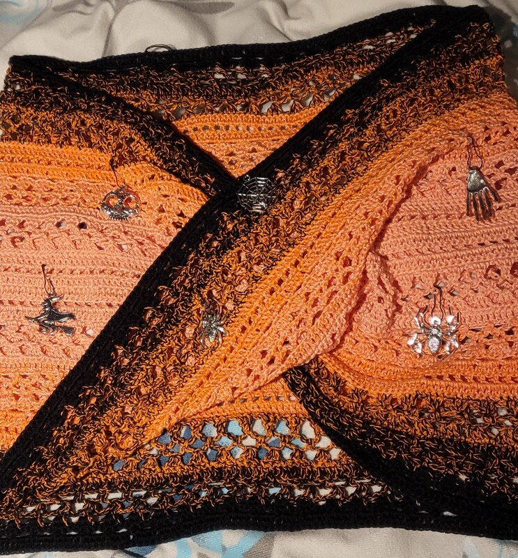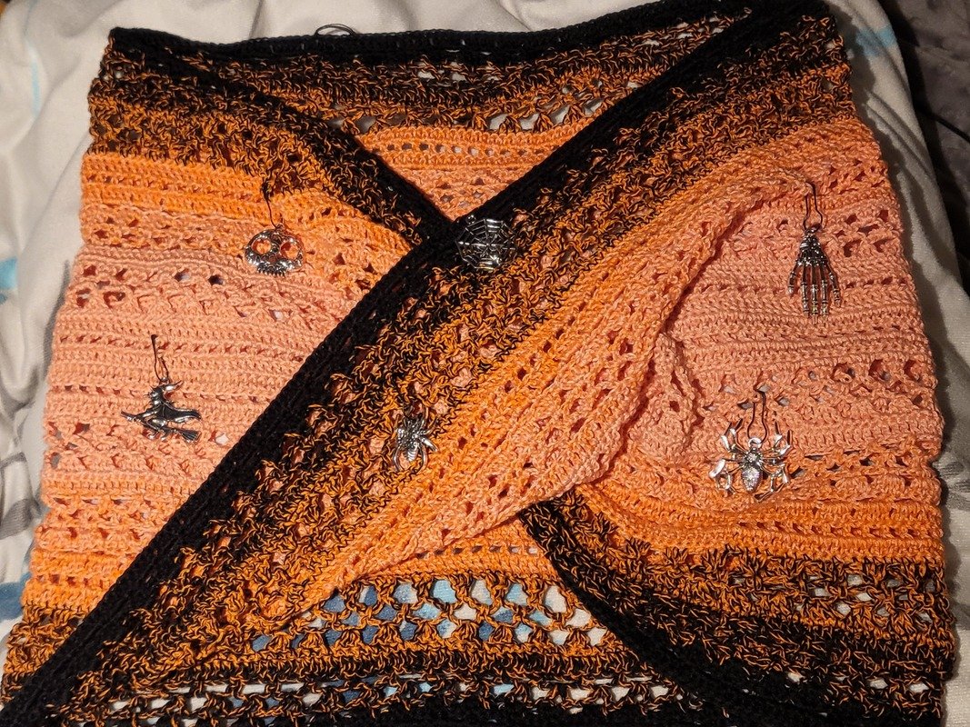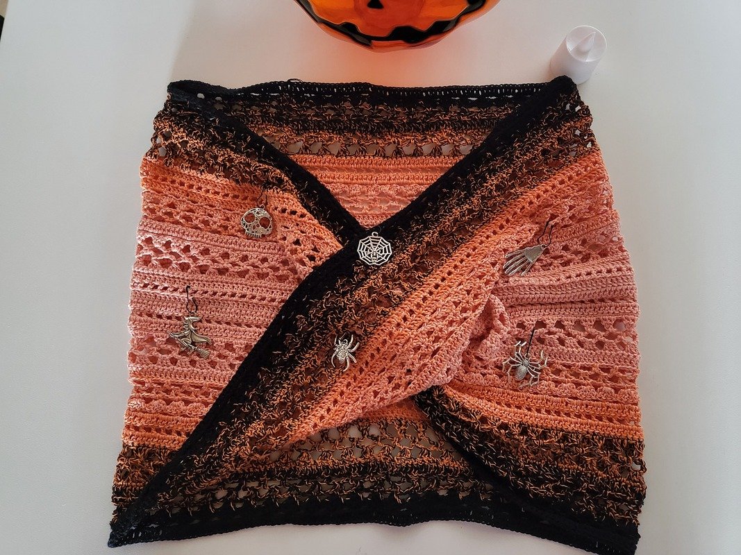 Für den Halloweentouch habe ich mir kleine Anhänger geholt und mit Maschenmarkieren am Loop festgemacht. So kann man den Loop das ganze Jahr über tragen.