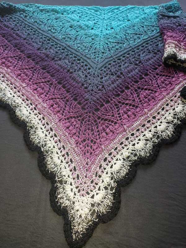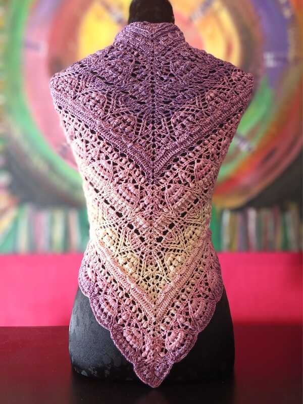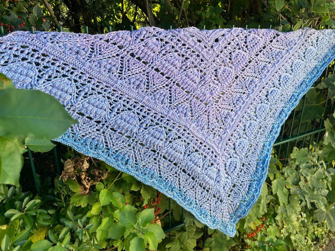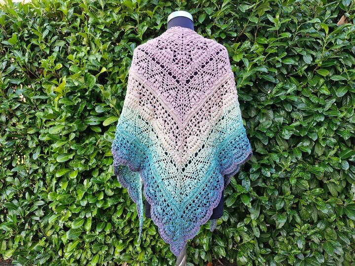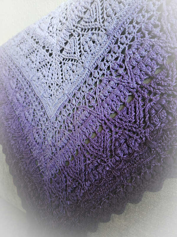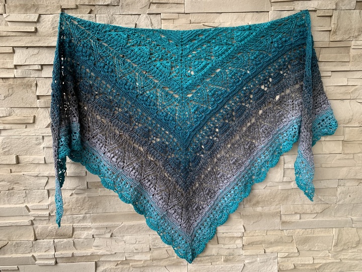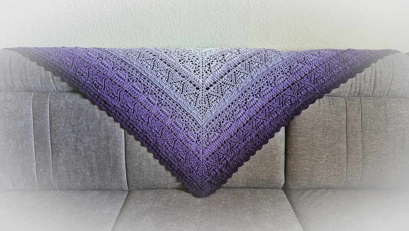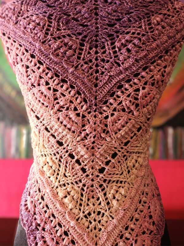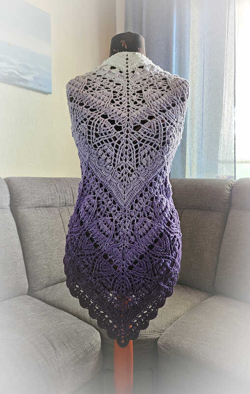 I love playful, somewhat decadent shawls, and the “Kyria” shawl was created out of this passion! It is a beautiful shawl, with lots of different stitches and patterns. Boredom is certainly not an option here! The shawl can be crocheted in any size, as the rows are repeated.