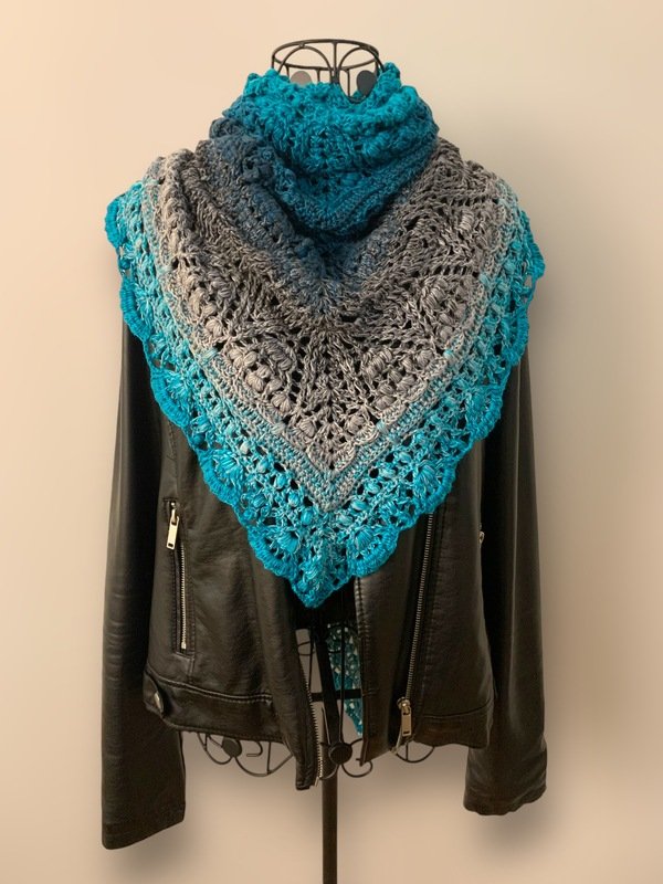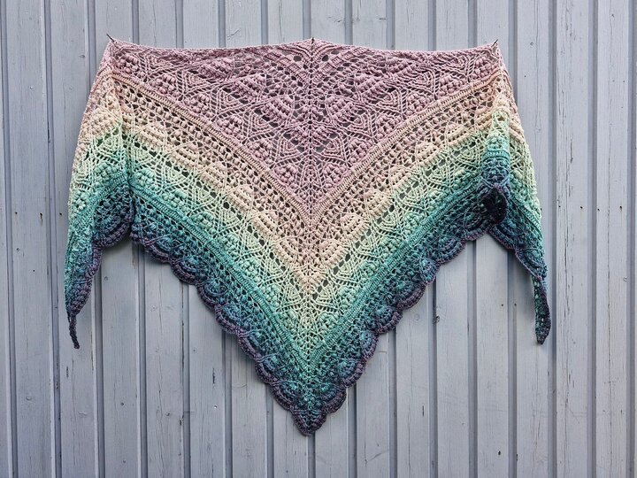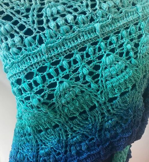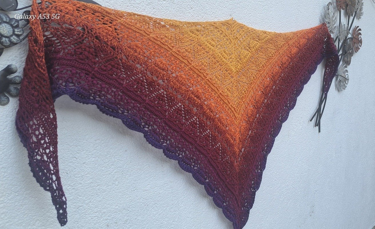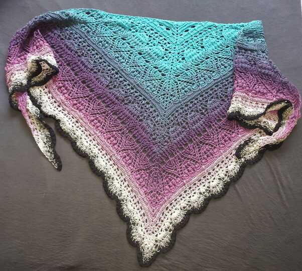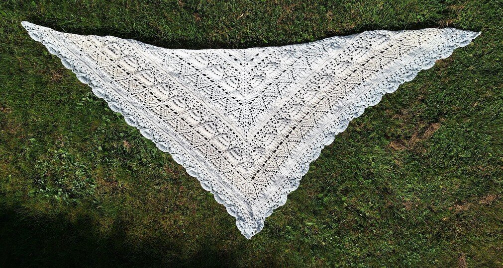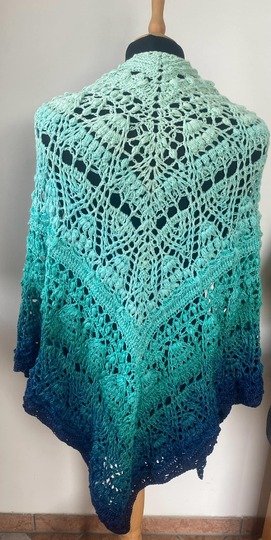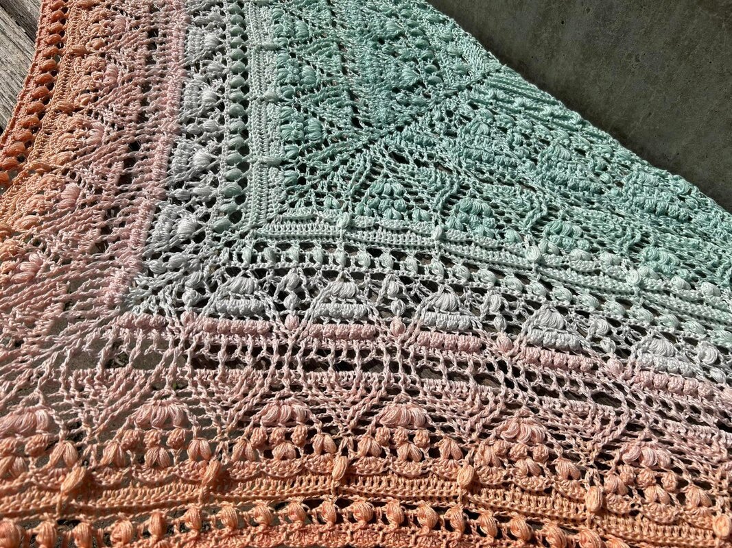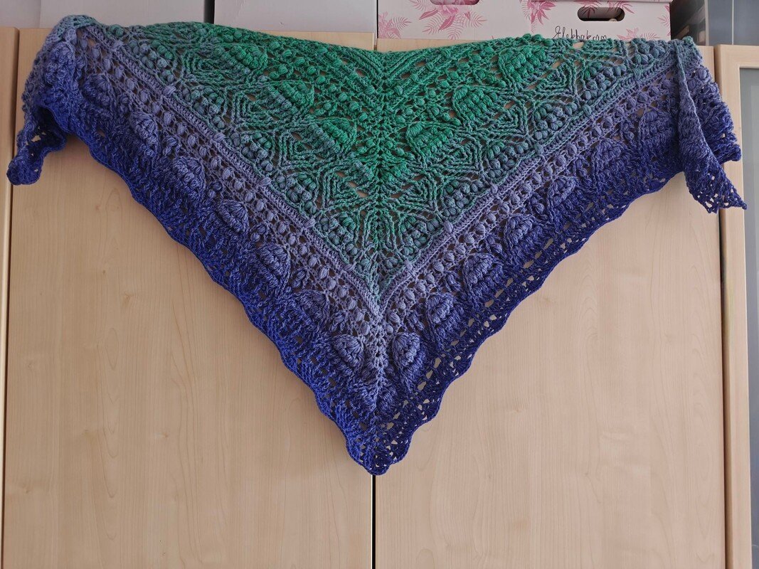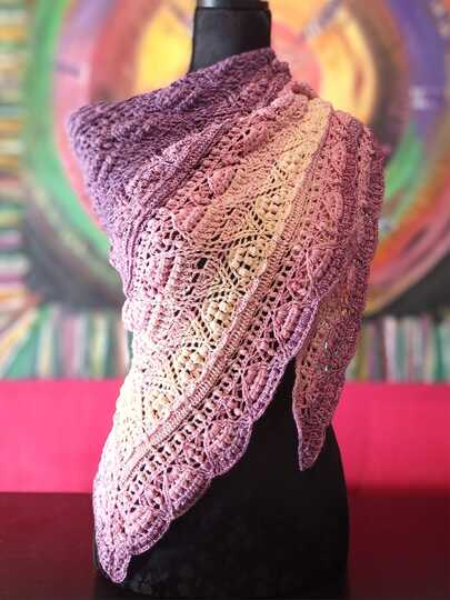 I love playful, somewhat decadent shawls, and the “Kyria” shawl was created out of this passion! It is a beautiful shawl, with lots of different stitches and patterns. Boredom is certainly not an option here! The shawl can be crocheted in any size, as the rows are repeated.