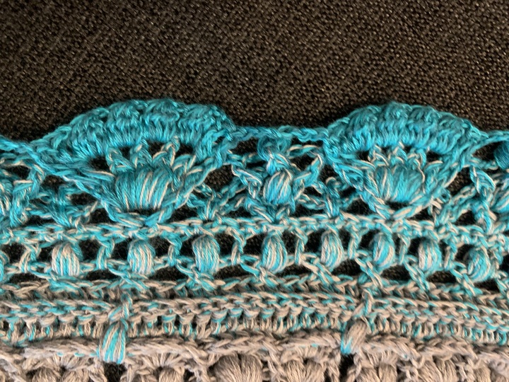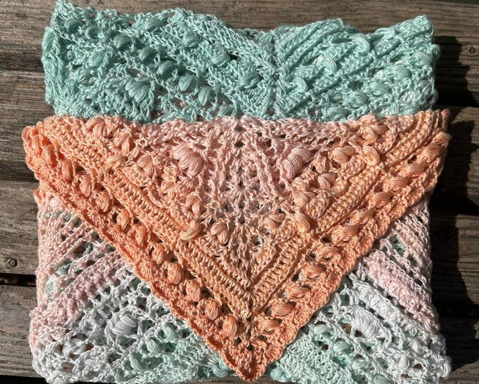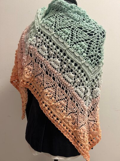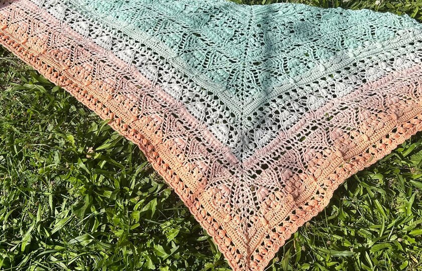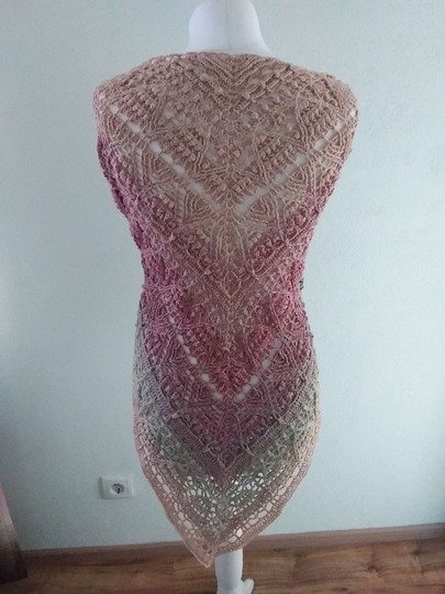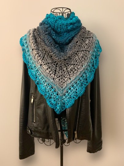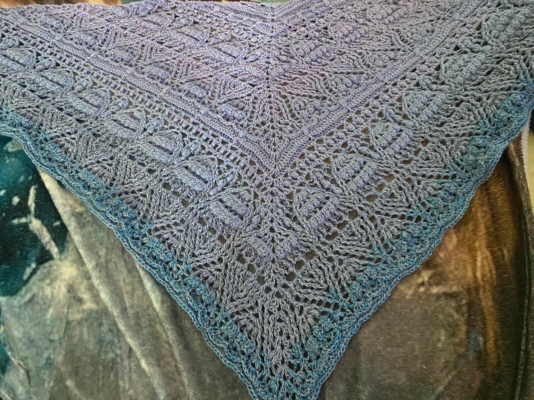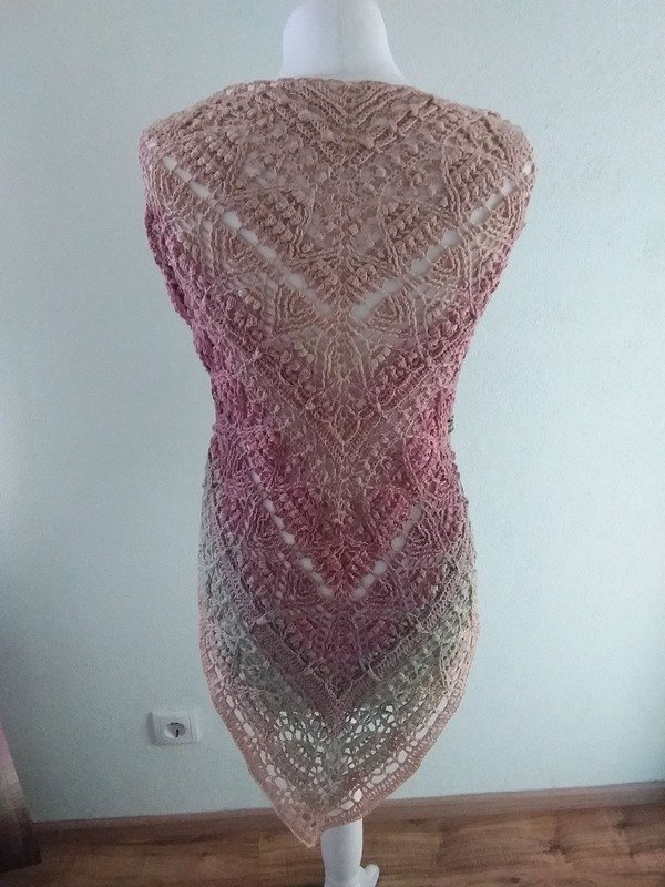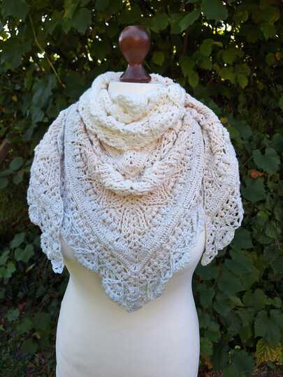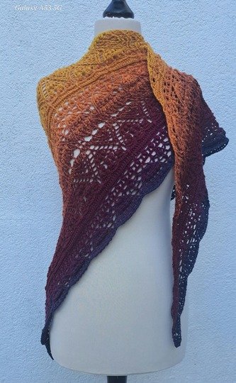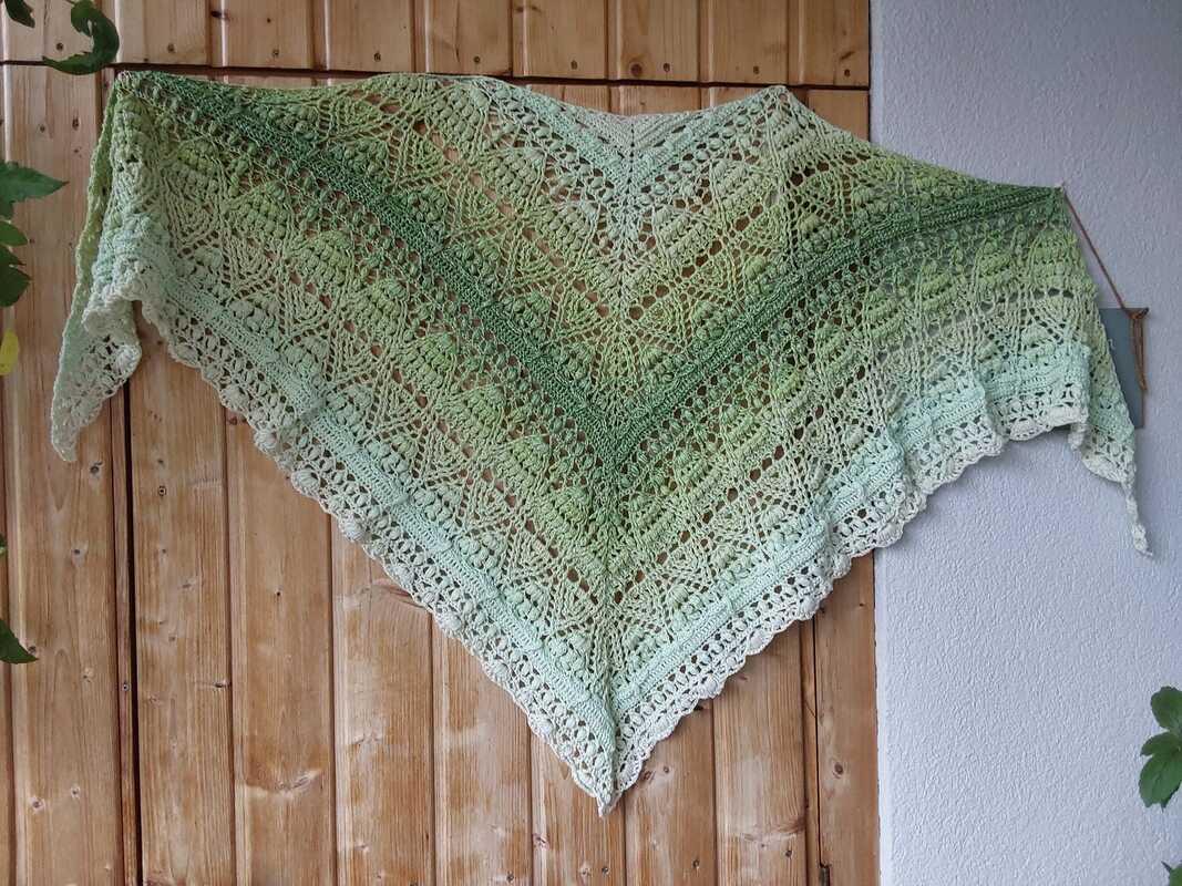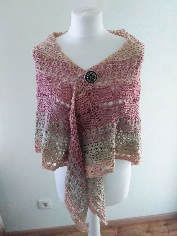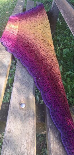 I love playful, somewhat decadent shawls, and the “Kyria” shawl was created out of this passion! It is a beautiful shawl, with lots of different stitches and patterns. Boredom is certainly not an option here! The shawl can be crocheted in any size, as the rows are repeated.
