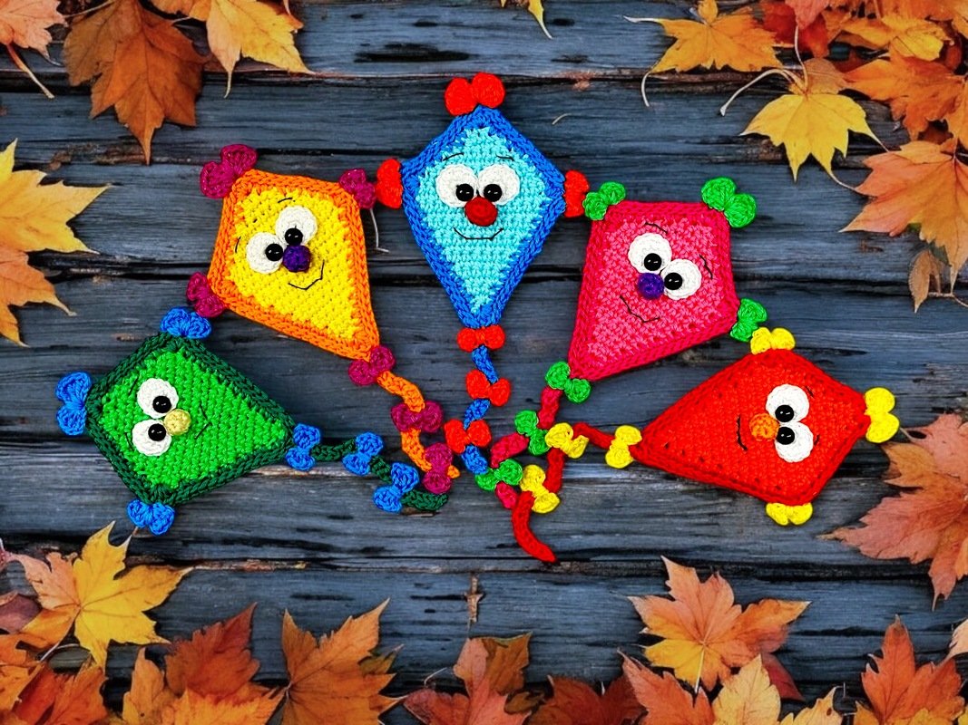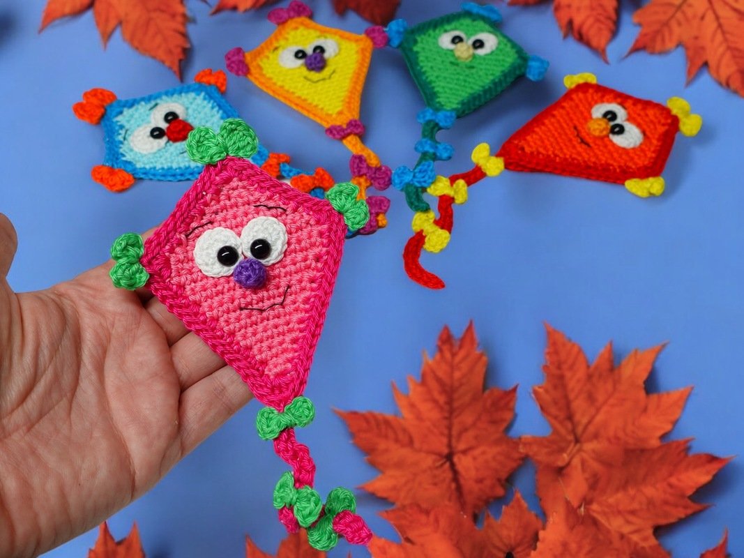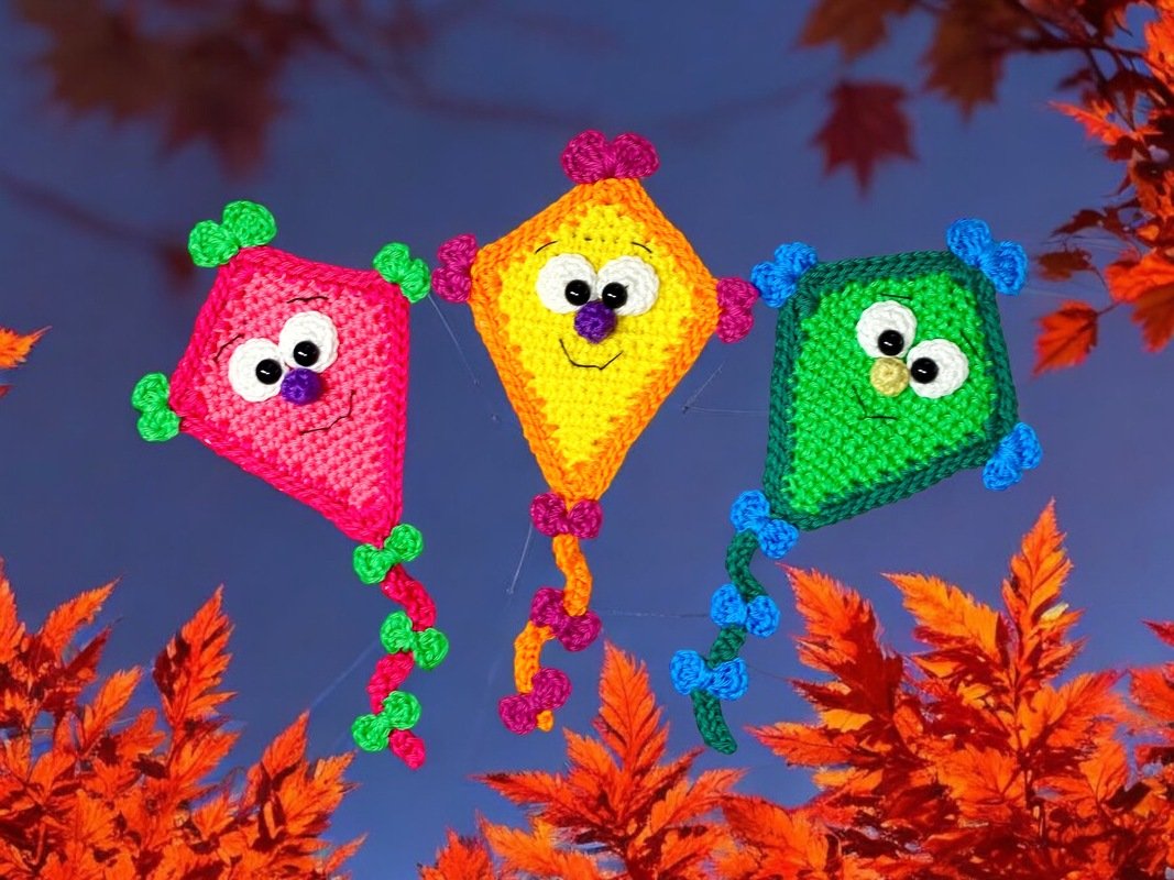 Get the autumn kite crochet pattern and add some color to your fall! With this pattern, you can crochet cool, colorful kites to brighten up your windows or use them as stylish plant stakes. Quick and easy to make, it's perfect for using up leftover yarn.