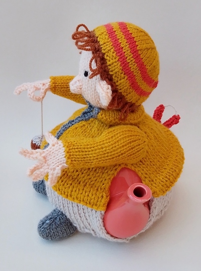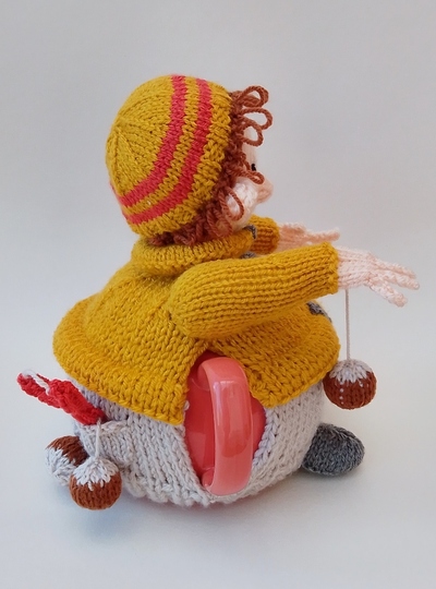 The Conker Player tea cosy portrays someone playing outside, dressed in a coat and woolly hat, holding up a conker as if in the middle of a game. With a big horse chestnut on the string and a couple of spares behind them, the scene is set. The windswept hair, created with loopy stitches, peeks out from beneath the hat, adding to the playful look. A catapult and another conker are tucked into the back pocket, completing the scene.
