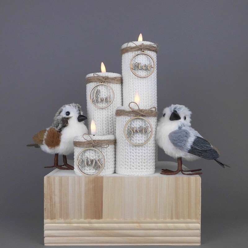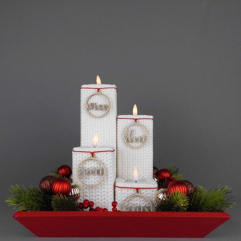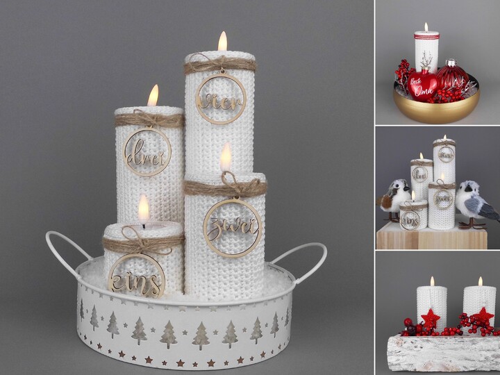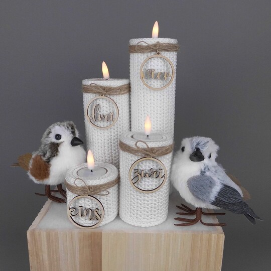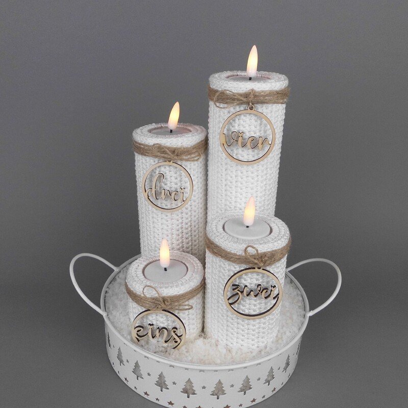 The beautiful, simple tea light holders are easy to decorate according to your personal taste, not only during the holiday season, and are super versatile to use, for example in an Advent arrangement, in an Advent decoration on a tray or in a bowl with Christmas baubles or little plush birds, or on an Advent and Christmas wreath. You can see some decorating ideas in the attached photos.