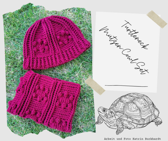 In dieser Anleitung erkläre ich euch, wie man dieses süße Mützen-Loop-Stulpen-Set mit Schildkröten zaubern kann.