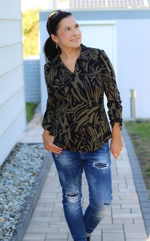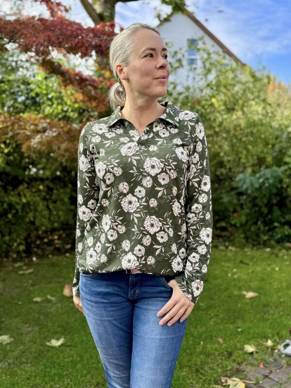 Der elegante Kragen und der V-Ausschnitt mit Blende verleihen der Bluse eine raffinierte Ausstrahlung. Du hast die Wahl zwischen verschiedenen Ärmellängen: Entscheide dich für Kurzarm oder Langarm und kreiere deinen ganz eigenen Look. Wähle aus einem säumbaren Ärmel, einem mittelweiten Ärmel mit Schlaufe oder einem weiten Ärmel für einen lässigen Gummiabschluss.
