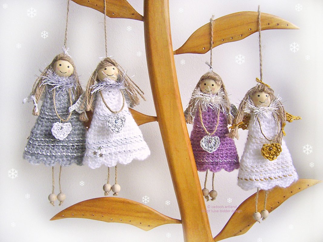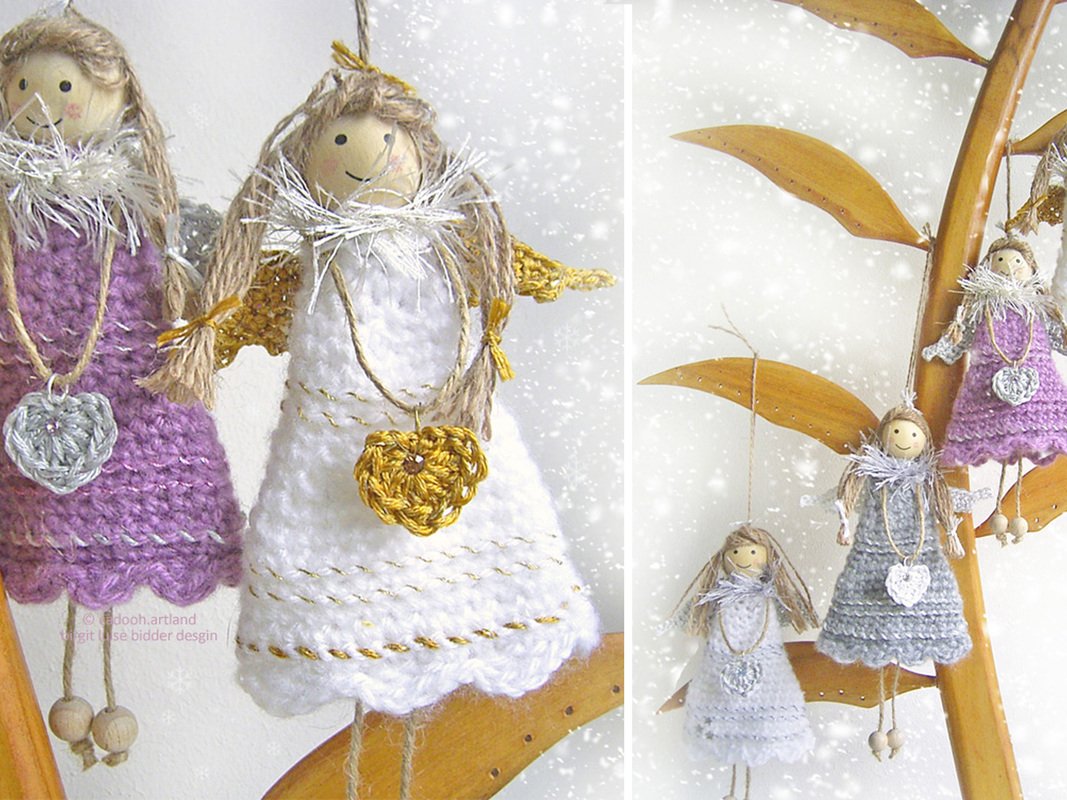 Herzengel sind kleine Häkel- und Bastelobjekte mit den derzeit trendigen Gesichts-Holzkugeln.