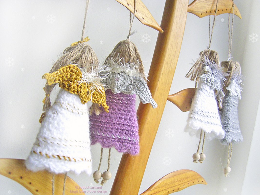 Verbrauch ca. 7 g pro Engel, dazu dünne Glitzergarne zum Besticken