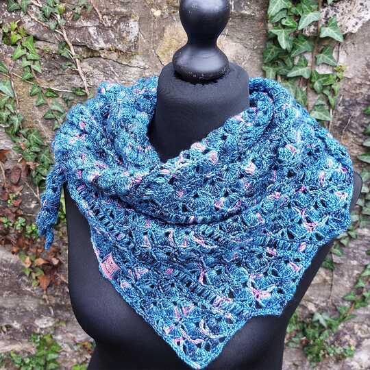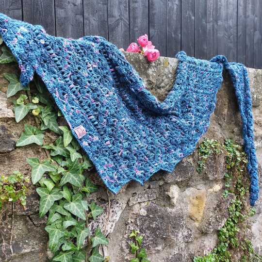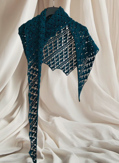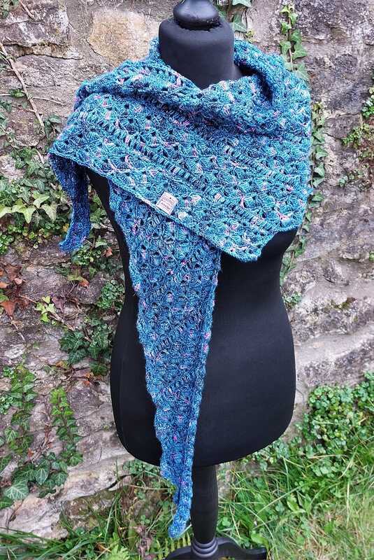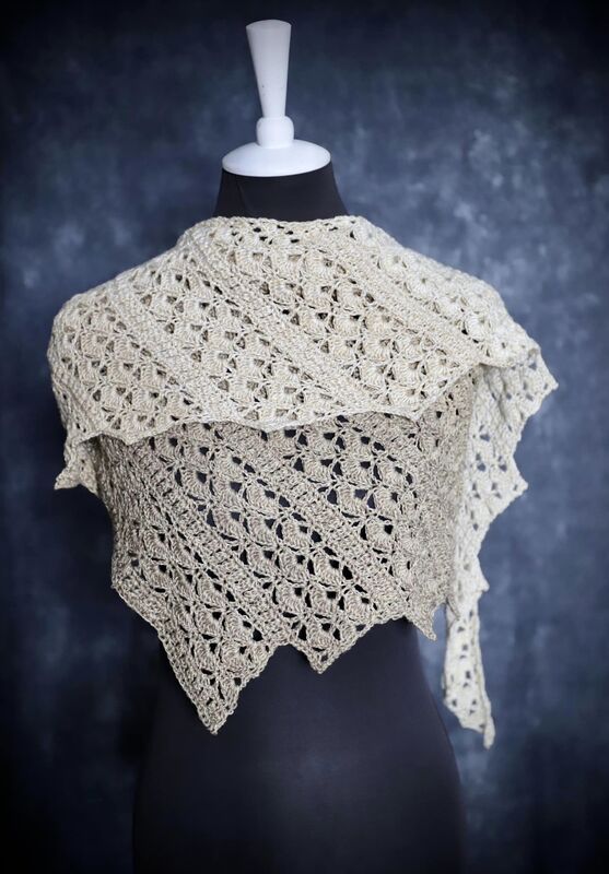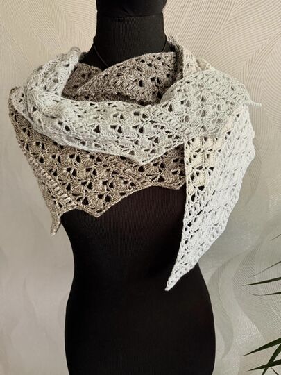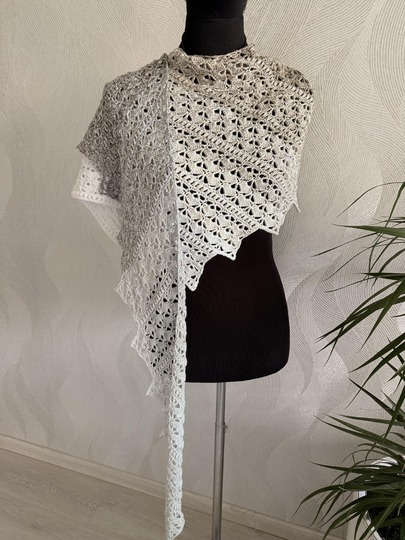 The shawl measures approximately 230 cm x 48 cm, but can be enlarged as required