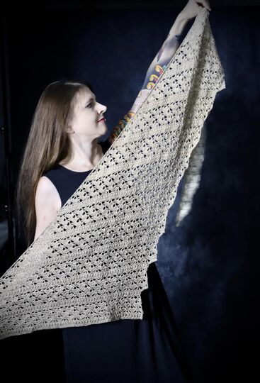 In the example, the shawl measures approximately 230 cm x 48 cm, but can be enlarged as required as it is a continuous pattern.