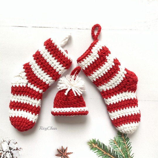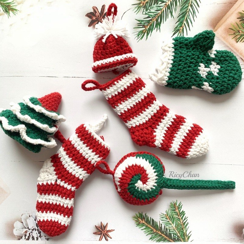 Quick and easy crochet projects are here for you. Sit around with the kids and spools of wool to make pretty little things for the pine tree. Socks, decorative candies. How sweet and warm ️