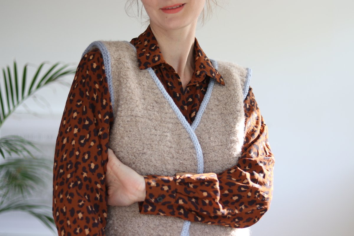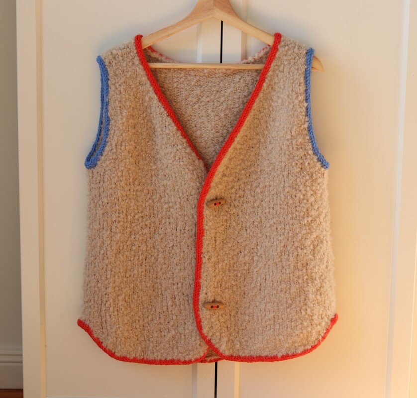 The vest requires some knitting experience as it is worked with bouclé yarn. The knitting techniques used are basic, with the exception of picking up stitches from the edge.