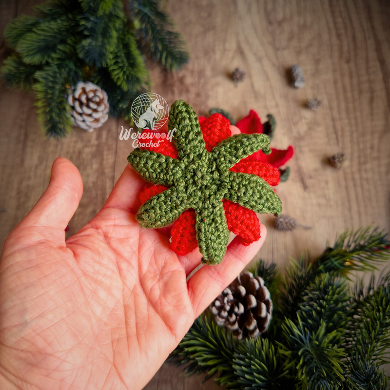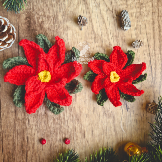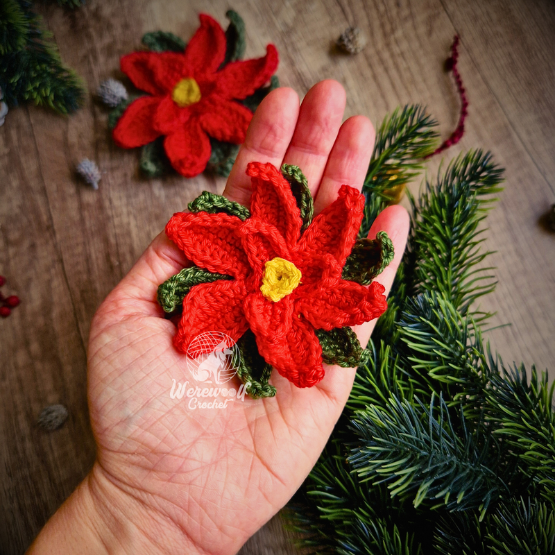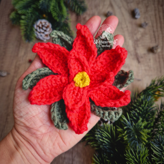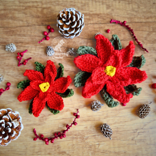 This is a pattern for a no sew poinsettia chirstmas flower. You can use any yarn you want. The pattern is designed to be beginner friendly, but you should already now the basic crochet stitches and the difference between back loops and front loops.