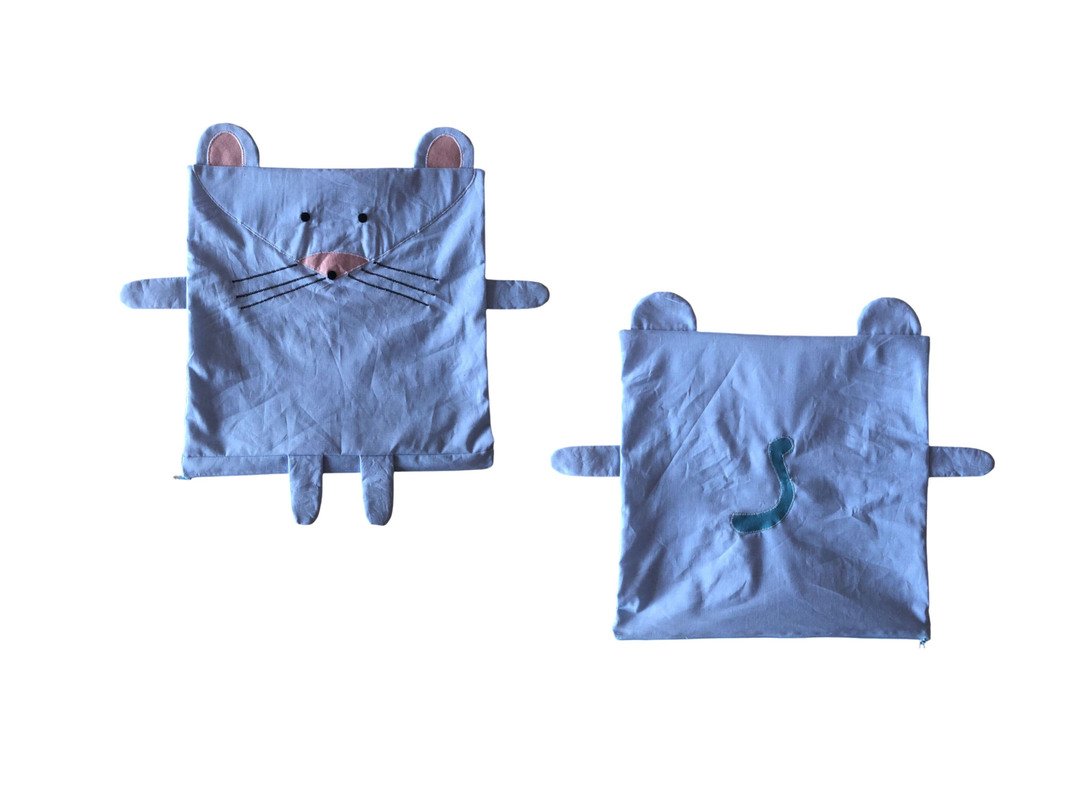 The cushion cover and pencil case are sewn from cotton fabrics. The plush toy is sewn from cuddly fabrics like minky fleece, velour, or fleece.