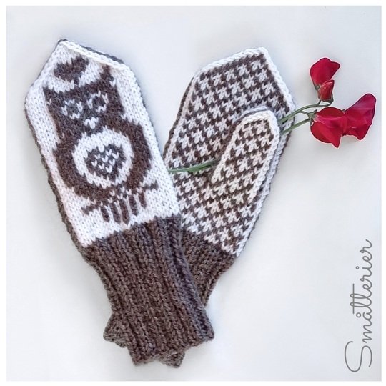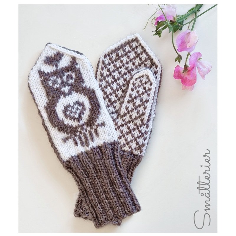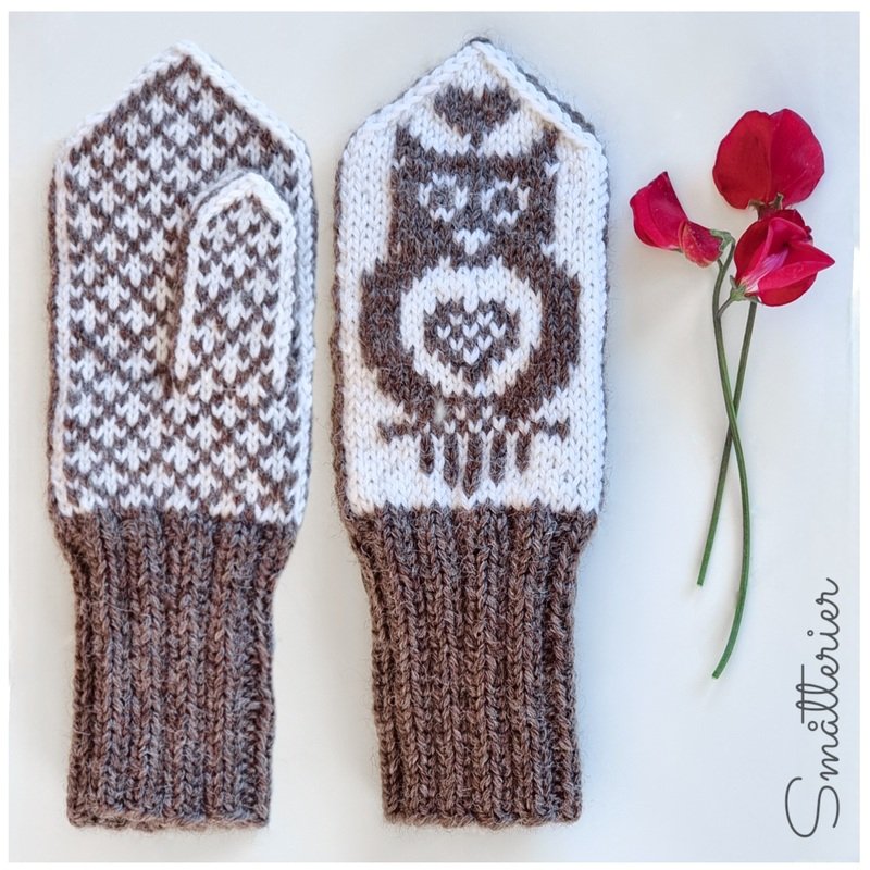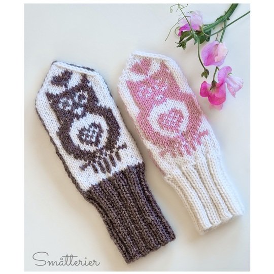 Owl Mittens for cildren, sizes 3-5 and 6-8 years.